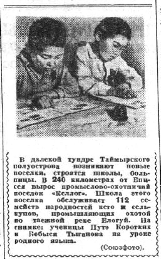 ЛИТЕРАТУРА НА НАЦИОНАЛЬНЫХ ЯЗЫКАХ МАЛЫХ НАРОДНОСТЕЙ КРАЙНЕГО СЕВЕРА. Ленинградское отделение Партиздата приступило к изданию серии брошюр на языках народов севера. Уже вышли из печати две брошюры на эвенкийском (тунгусском) языке: И. Кулагин, А. Пырерка и А. Тарташев. Советы севера. Лг., 1933, (60), и В. Свердлов. Как лечить больного человека. Лг., 1933, (9). В скором времени выходят еще шесть брошюр на этом языке, посвященных различным вопросам советского строительства на крайнем севере. На ненецком (самоедском) языке издана одна брошюра: И. Кулагин. Что такое суд. Лг., 1933, (7). На чукотском языке выходит брошюра: Я. П. Алькот. Что дала Октябрьская револю­ция трудящимся севера. Помимо того, изданы и издаются брошюры на на­найском (гольдском) языке.