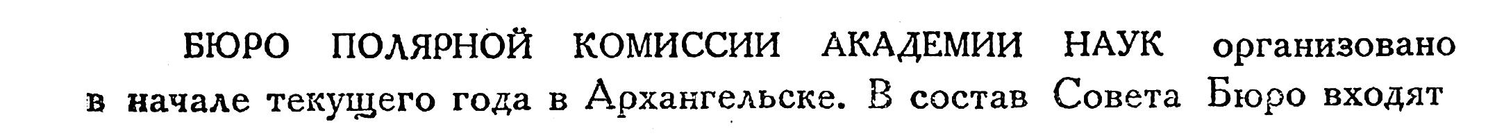 БЮРО ПОЛЯРНОЙ КОМИССИИ АКАДЕМИИ НАУК организовано начале текущего года в Архангельске. В состав Совета Бюро входят председатель А. И. Толмачев и члены Совета И. А. Перфильев, А. А. Чернов, Н. А. Кулик, С. В. Керцелли, H. М. Книпович, А. П. Шенников, М. Я. Рознер, Н. Г. Рослов, В. А. Горохов, А. А. Евдокимов, М. В. Дурново, В. И. Лебедев, т. Химчик и т. Марголин.