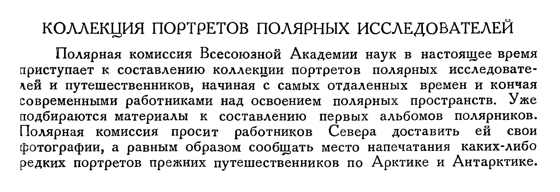 Полярная комиссия Всесоюзной Академии наук в настоящее время приступает к составлению коллекции портретов полярных исследовате­лей и путешественников, начиная с самых отдаленных времен и кончая современными работниками над освоением полярных пространств. Уже подбираются материалы к составлению первых альбомов полярников. Полярная комиссия просит работников Севера доставить ей свои фотографии, а равным образом сообщать место напечатания каких-либо редких портретов прежних путешественников по Арктике и Антарктике.