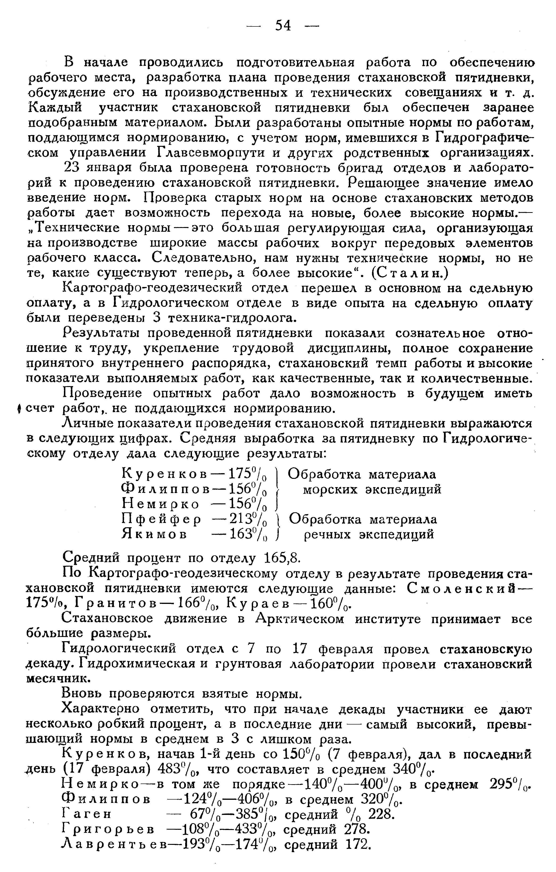 Личные показатели проведения стахановской пятидневки выражаются в следующих цифрах. Средняя выработка за пятидневку по Гидрологическому отделу дала следующие результаты: