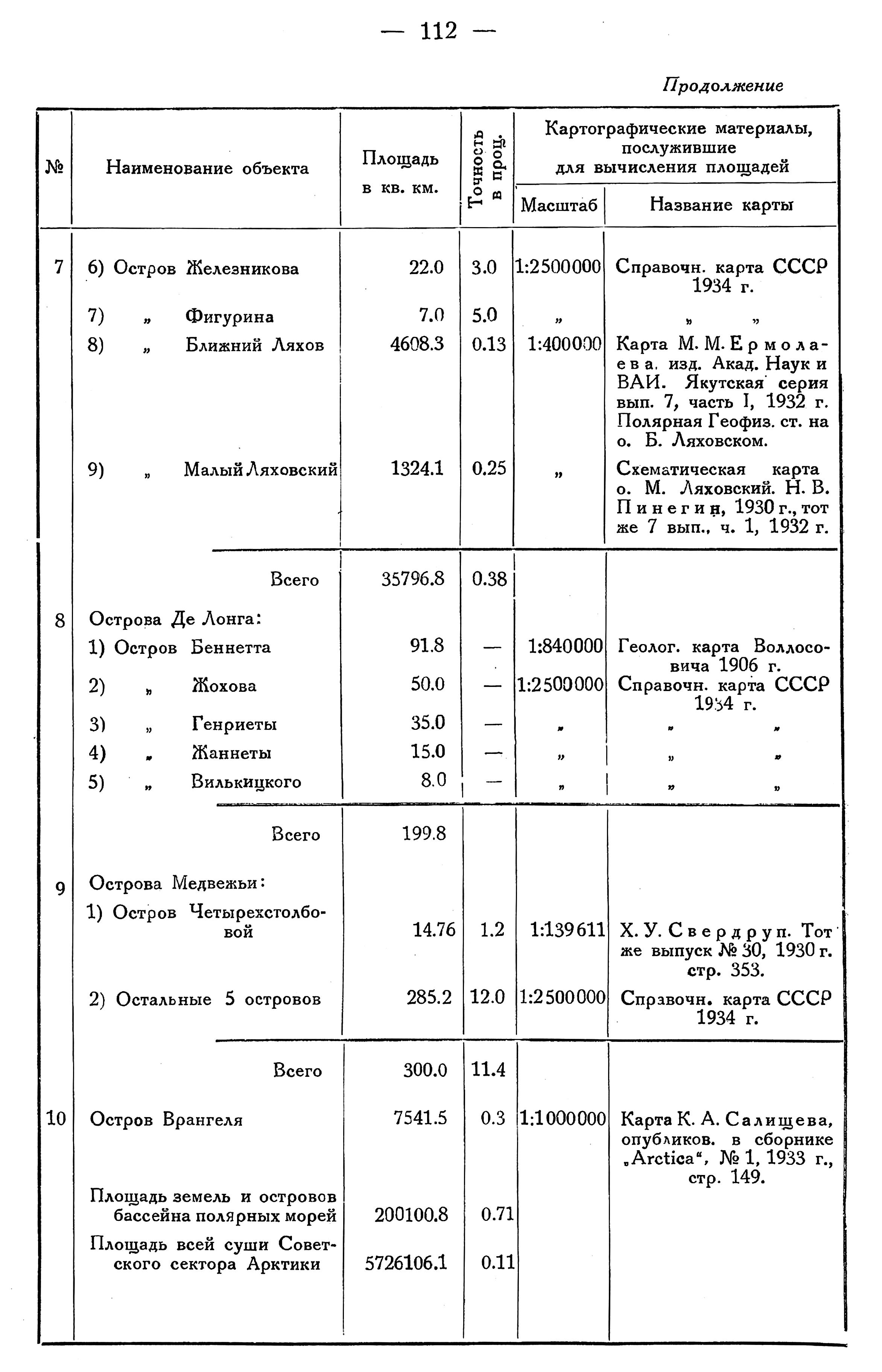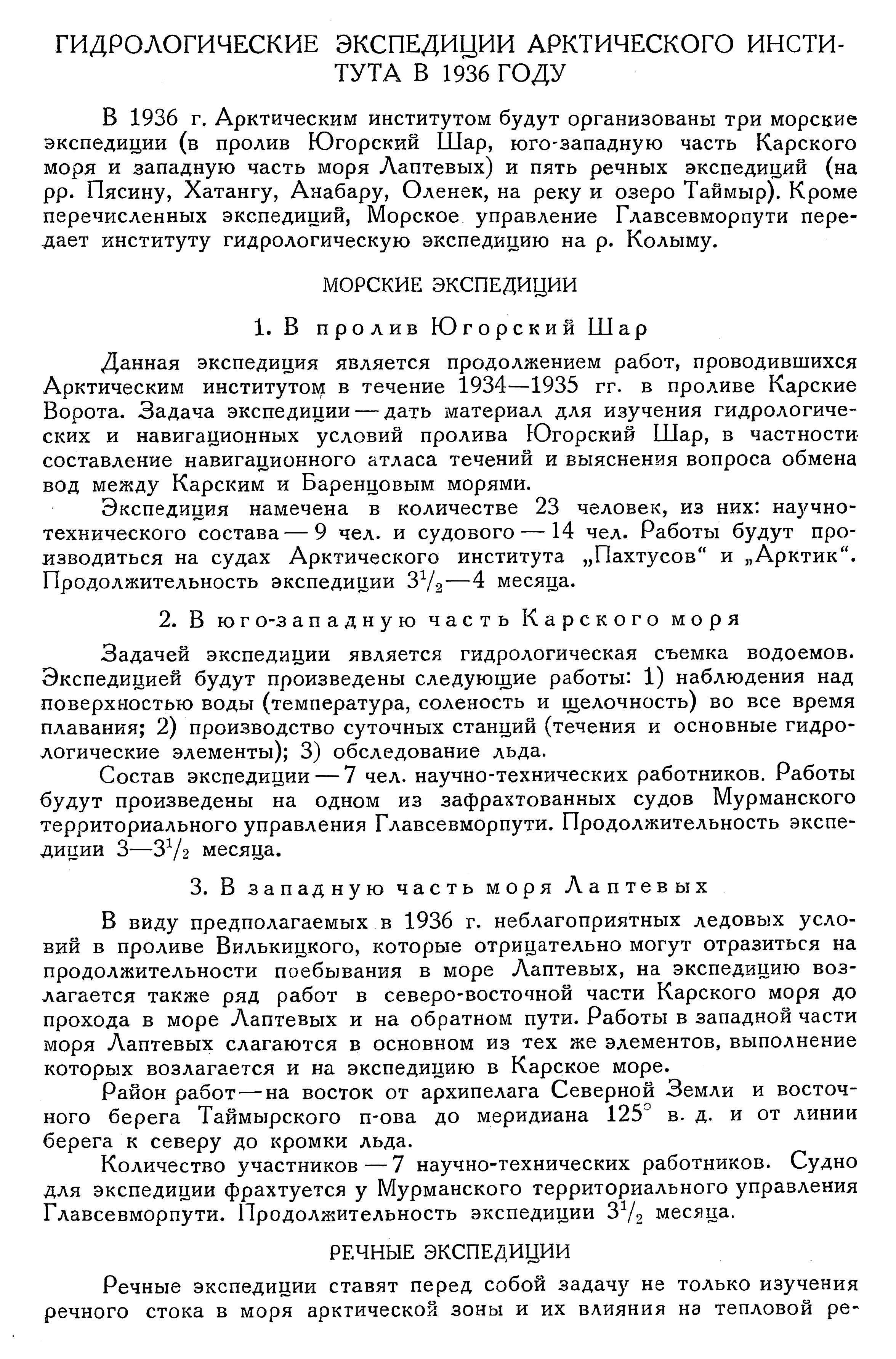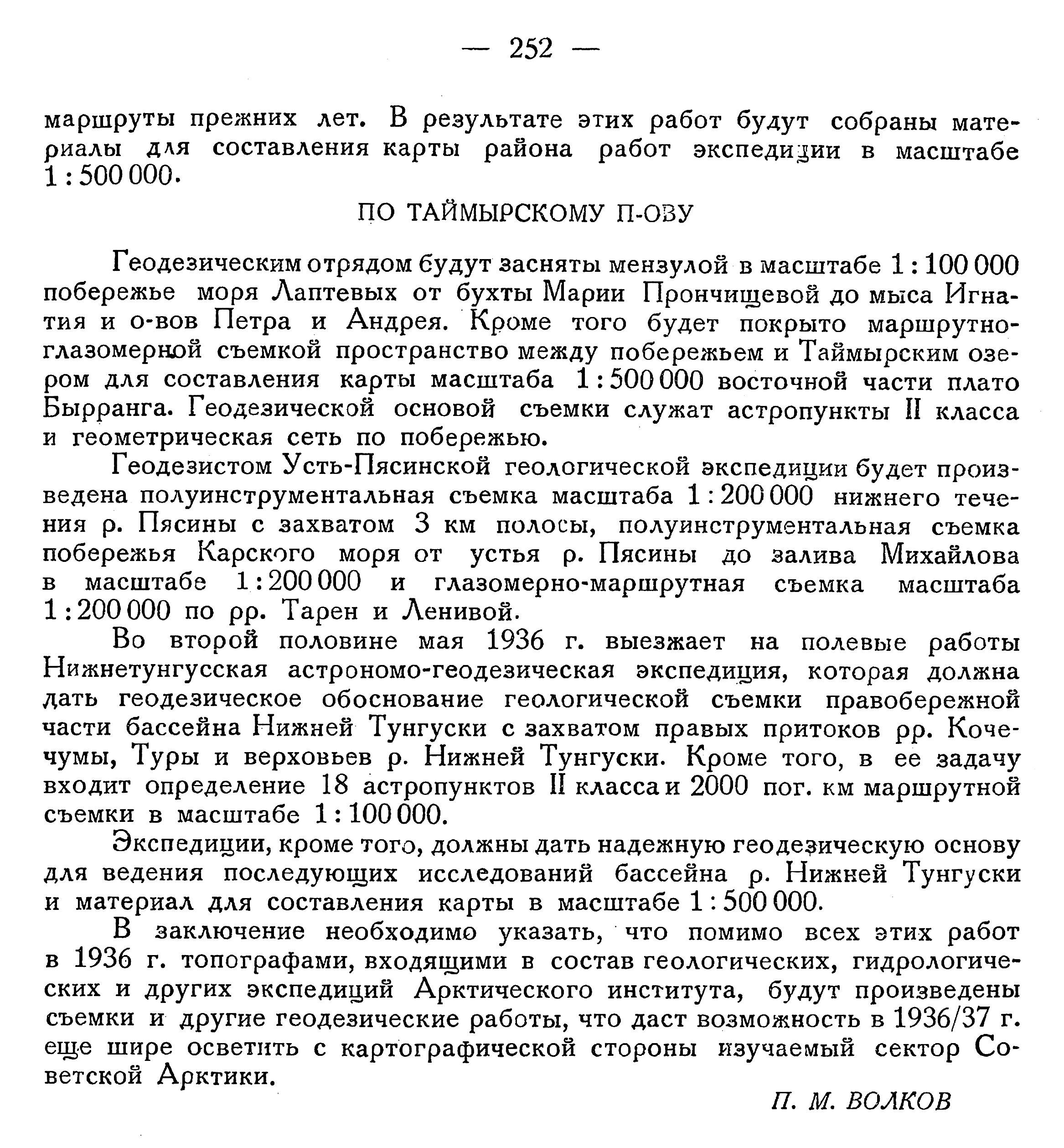 В заключение необходимо указать, что помимо всех этих работ в 1936 г. топографами, входящими в состав геологических, гидрологических и других экспедиций Арктического института, будут произведены съемки и другие геодезические работы, что даст возможность в 1936/37 г. еще шире осветить с картографической стороны изучаемый сектор Советской Арктики.