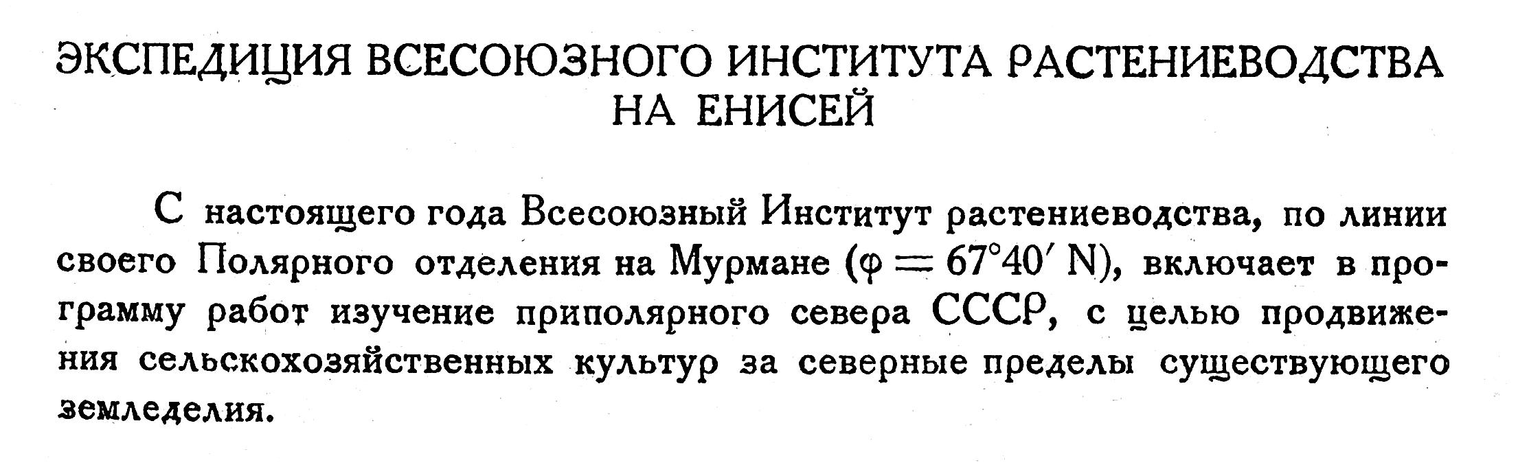 С настоящего года Всесоюзный Институт растениеводства, по линии своего Полярного отделения на Мурмане (φ = 67°40' N), включает в программу работ изучение приполярного севера СССР, с целью продвижения сельскохозяйственных культур за северные пределы существующего земледелия.