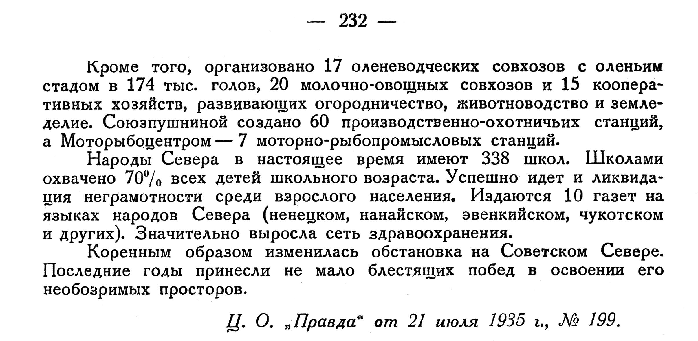 Постоянные голодовки населения Крайнего Севера, считавшиеся нормальным явлением во времена царизма, безвозвратно ушли в прошлое. Растет хозяйственная мощь Советского Севера, неизмеримо зажиточнее и культурнее живут теперь его люди.