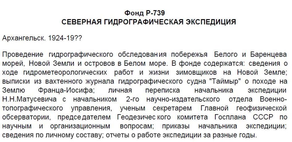 Фонд содержит следующие документы: приказы начальника экспедиции, заведующего судами, начальников береговых партий и командиров судов, планы и программы гидрографических работ на северных морях, доклады и отчёты об исполненных гидрографических и строительных работах, переписка о ремонте судов, о снабжении и по др. вопросам, а также материалы по личному составу.