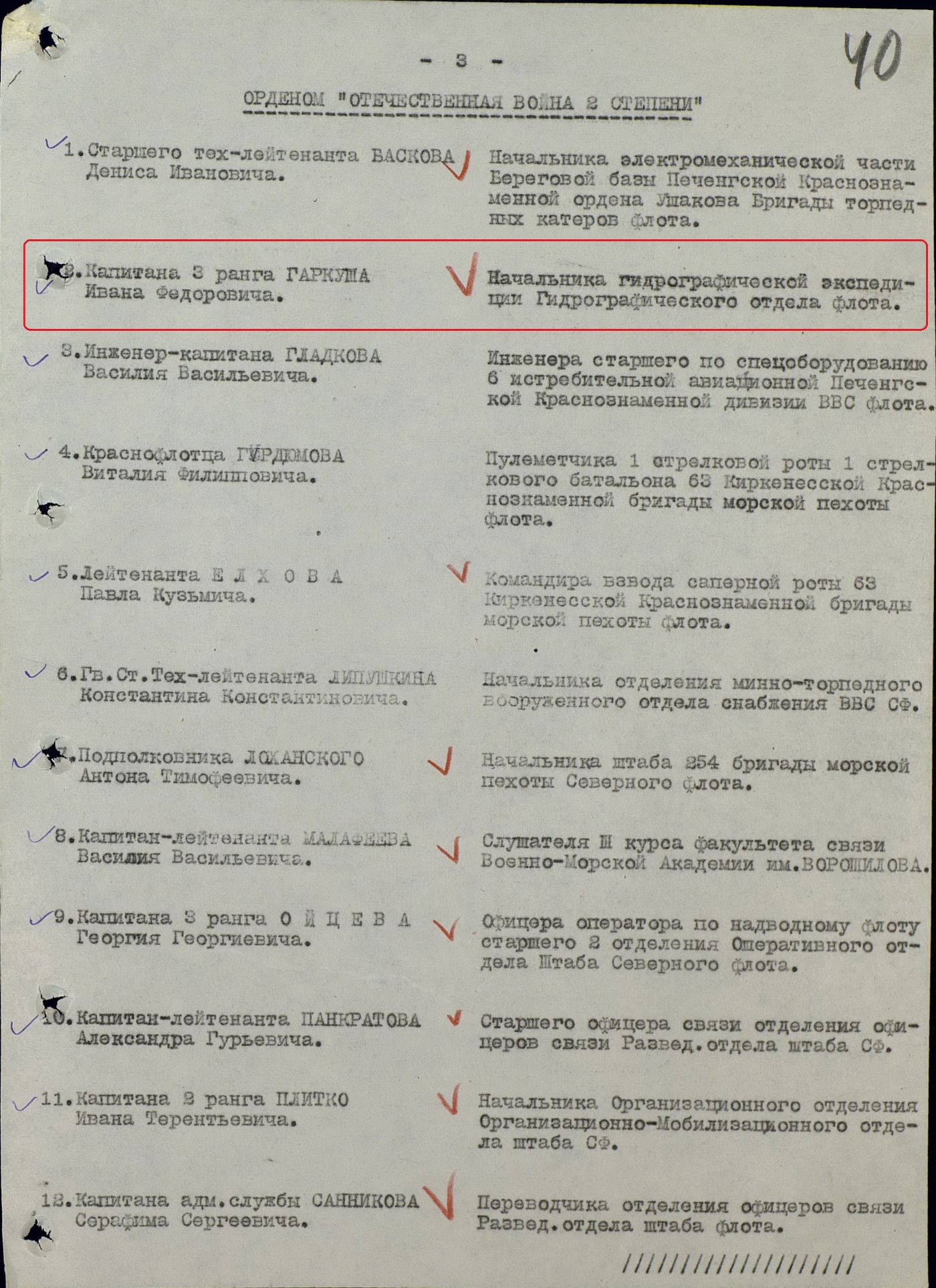 Капитан 3 ранга ГАРКУША ИВАН ФЕДОРОВИЧ энергичный и волевой офицер. Дисциплинированный, требовательный к себе и подчиненным. Обладает хорошими организаторскими способностями. В результате умелого руководства подчиненными, часть капитана 3 ранга Гаркуша, успешно оправляется с задачами по гидрографическому обеспечению боевой деятельности Сев. Флота. На 7 ноября 1944 года прослужил в КА и ВМФ 18 лет.