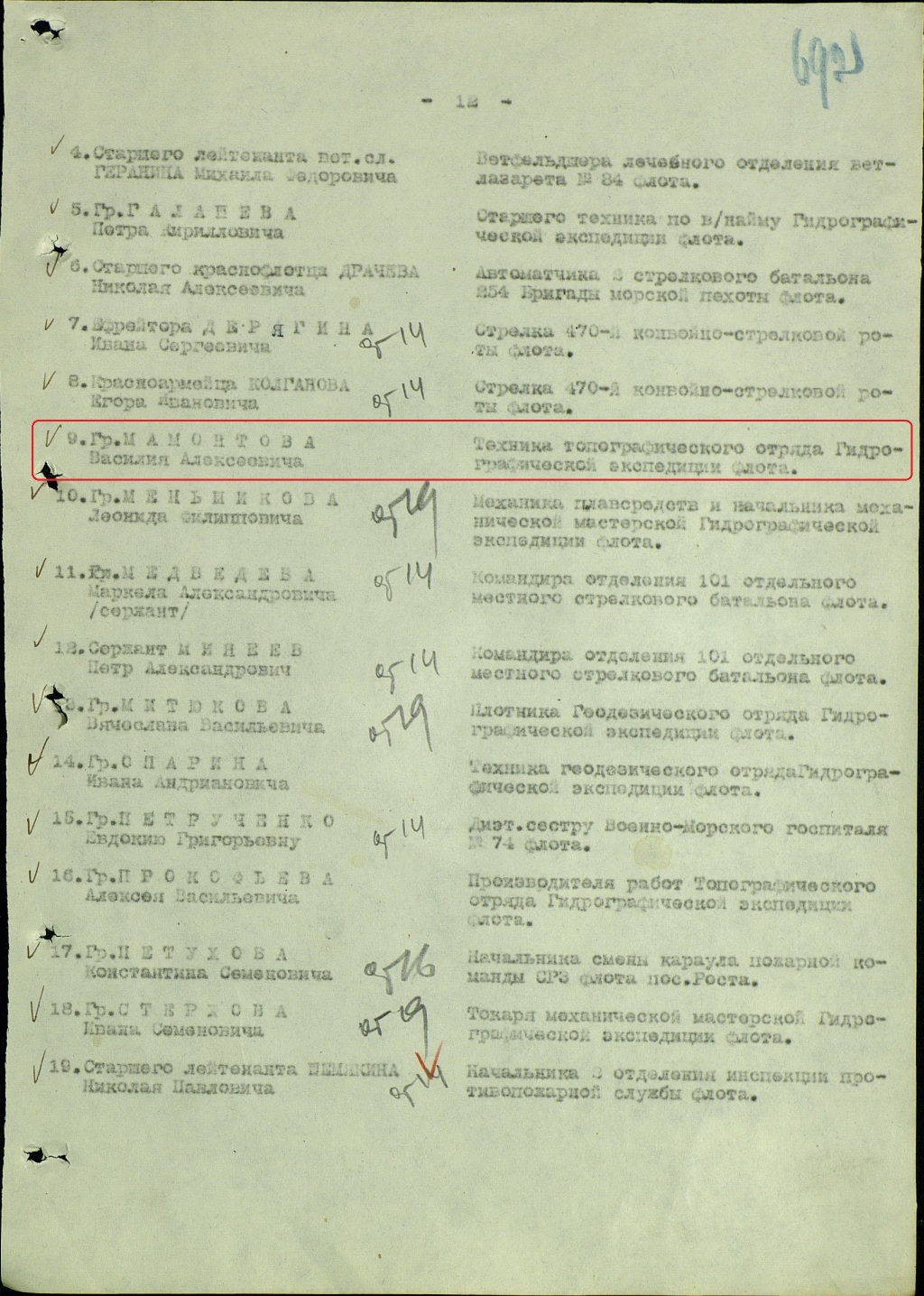 Будучи на 50% укомплектован личным составом, работал в гористой местности, удаленной т берега, тов. МОРОЗ И.Д. перевыполнял до 145% месячные нормы. Произвел съемку площади 50 кв.км. Материалы работ, особенно мерной линии, были использованы кораблями С.Ф.