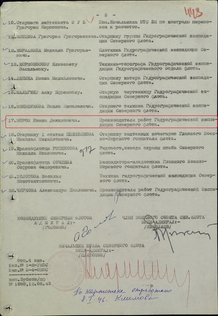 Своей безупречной работой иза этот период времени тов. МОРОЗ И.Д. способствовал эффективной боевой деятельности объектов Б.О., кораблей Беломорской Флотилии и С.Ф., а так же гидро-штурманскому изучению северного театра.