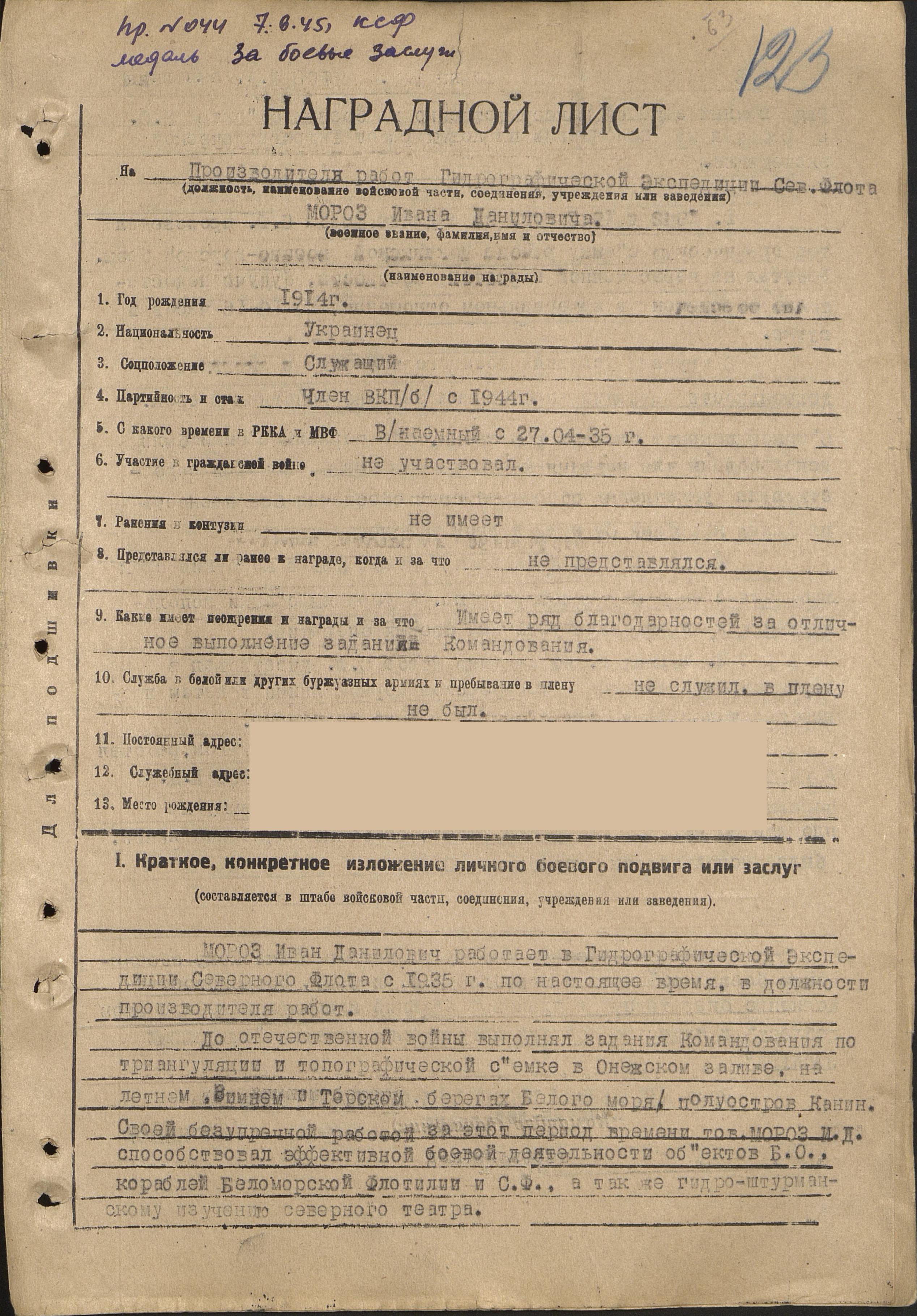 В дни отечественной войны тов. МОРОЗ И.Д. выполнил ряд выжных заданий непосредственно на боевых объектах Б.О. и работал на выполнении плановых работ Гидрографической экспедиции.
