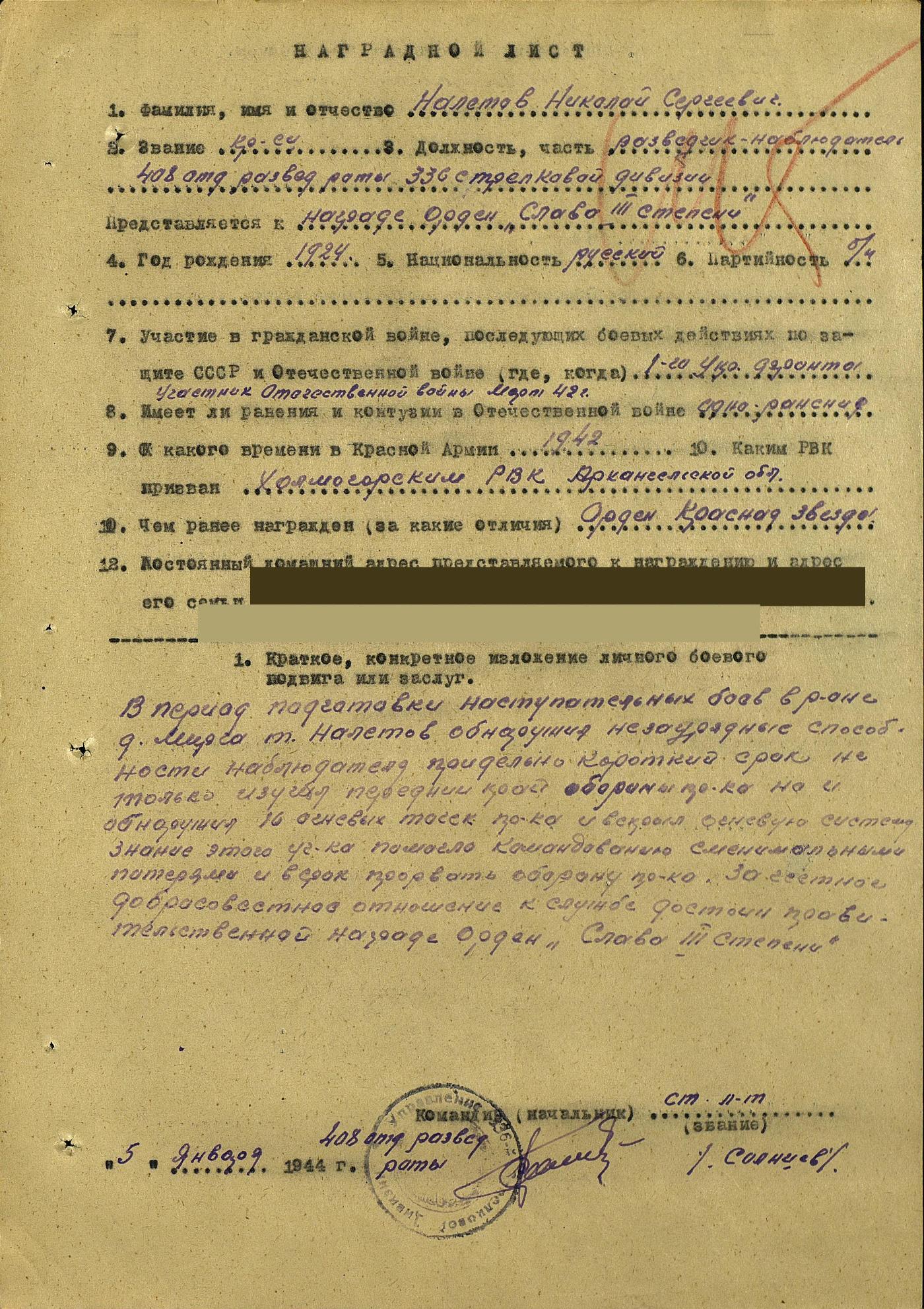 За период наступательных боев с 15 марта 1945 г. т. Налетов беспрерывно обеспечивал выбот наблюдательного пункта и вел наблюдение за движением и передним краем немцев. Особенно отличился т. Налетов 17 апреля 1945 г. Он получил задачу разведать высоту 304 и установить на ней наблюдательный пункт. Подойдя к высоте с четырьмя, приданными в его распоряжение, саперами, т. Налетов установил что на высоте находится боевое охранение противника. Т. Налетов, под прикрытием саперов, подполз к немецким пулеметчикам и гранатами забросал окоп в котором они находились. Три гитлеровца были убиты. Т. Налетов вскочил в окоп и огнем из пулемета прикрывал подход саперов. Немцы, пытаясь вернуть высоту, предприняли контратаку, но под командованием т. Налетова четыре сапера удержали высоту до подхода нашей пехоты. Достоин Правительственной награды орденом Отечественной войны II степени. Командир 408 отд.развед.роты Капитан [подпись] /Солнцев/ Достоин Правительственной награды орденом Отечественной войны II степени. Начальник разведотдела 336 стр. Житомир. ордена Суворова II ст. дивизии Капитан [подпись] /Пахомов/ "_" мая 1945 г.