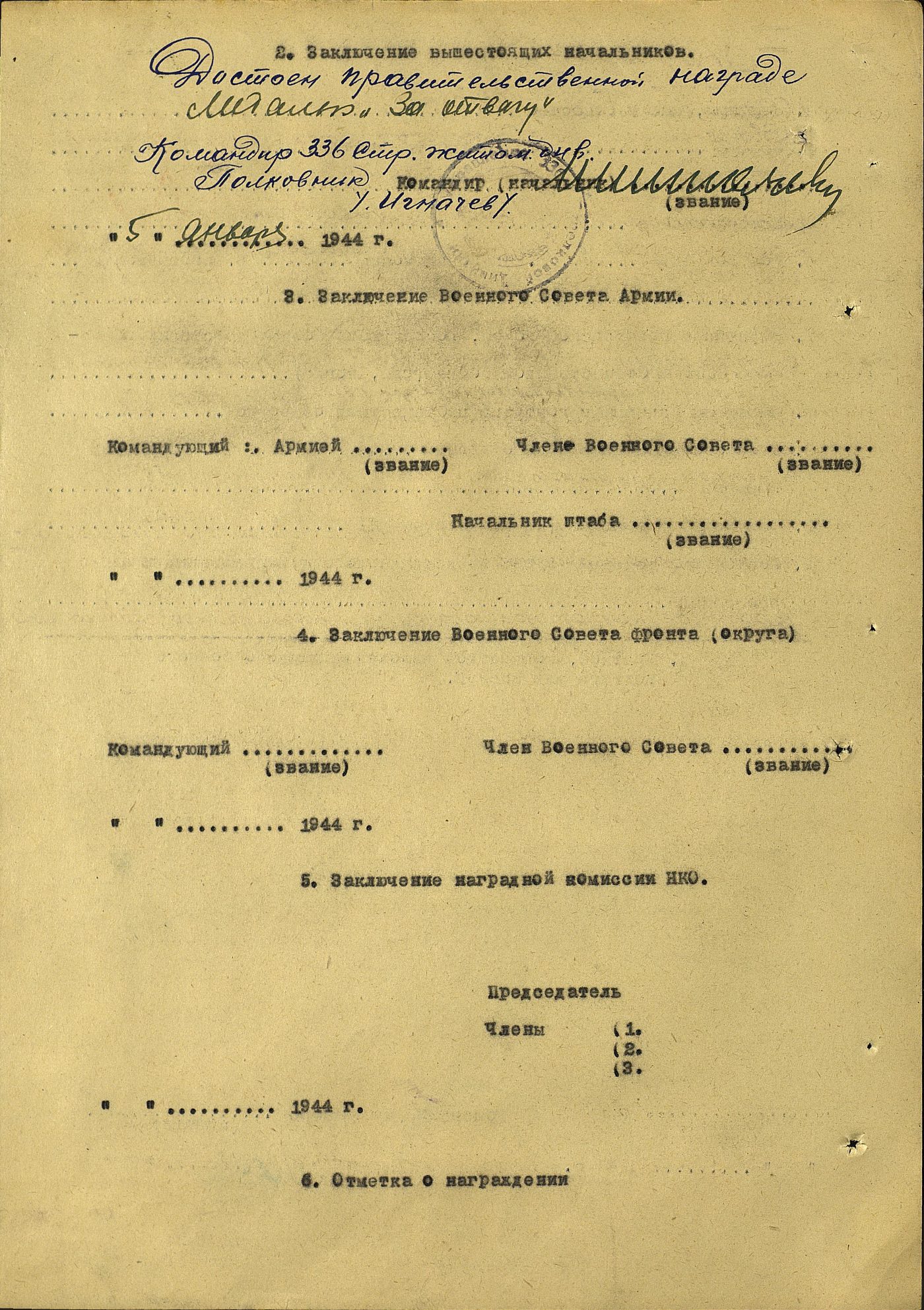Знание этого участка помогло командованию с минимальными потерями и в срок прорвать оборону пр-ка. За честное добросовестное отношение к службе достоин правительственной награды орден "Славы III степени".