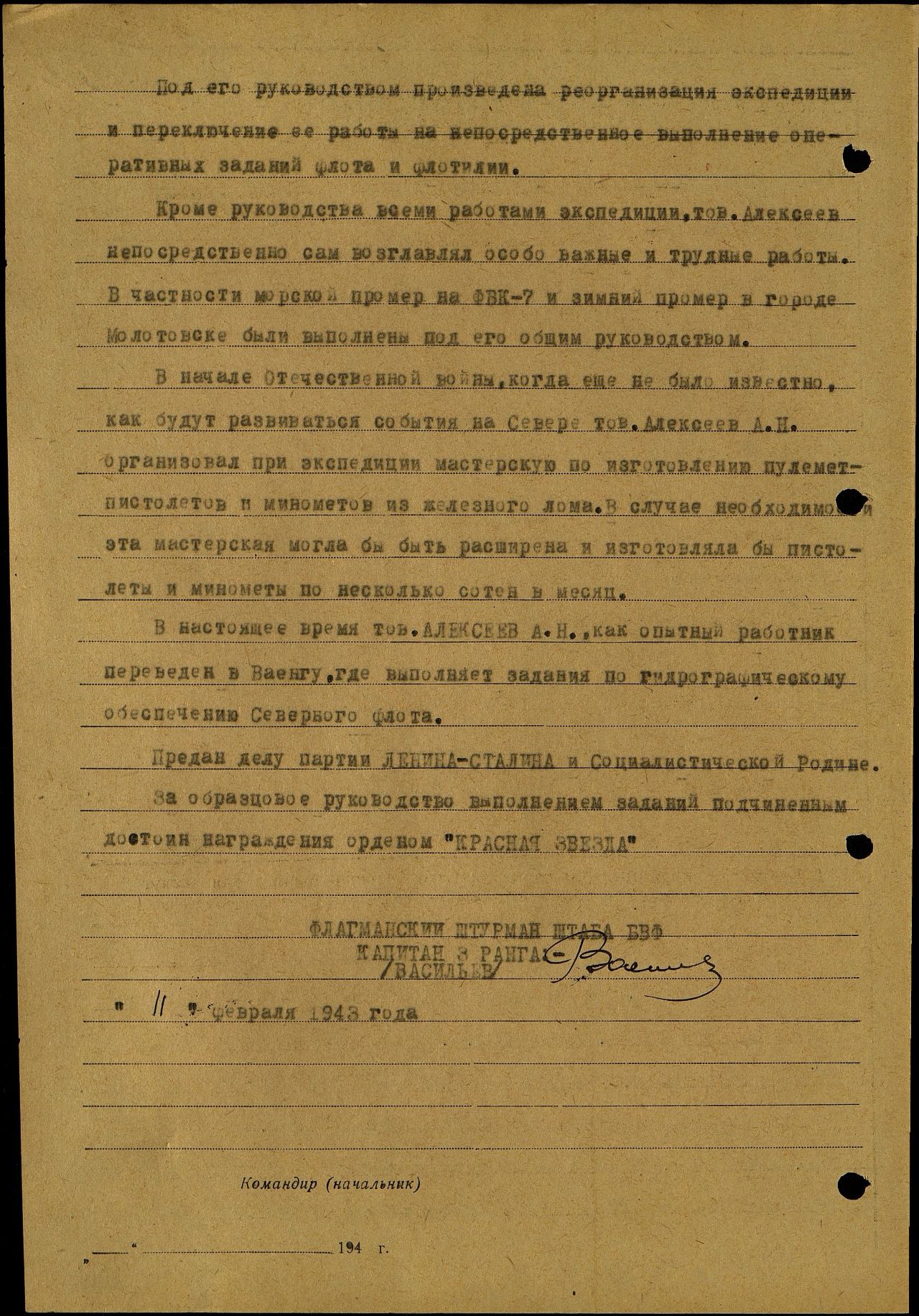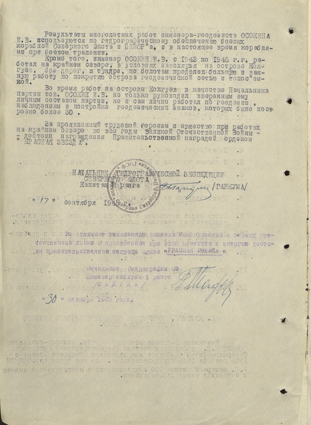 Начальник 1-й геодезической партии, инженер-геодезист ОСОКИН И.В. работает в составе Гидрографической Экспедиции Северного Флота и работает над изучением северного театра с 1939 года по 1945 год включительно. За это время тов. ОСОКИН И.В. построил свыше 100 геодезических и навигационных знаков и определил точно их координаты.