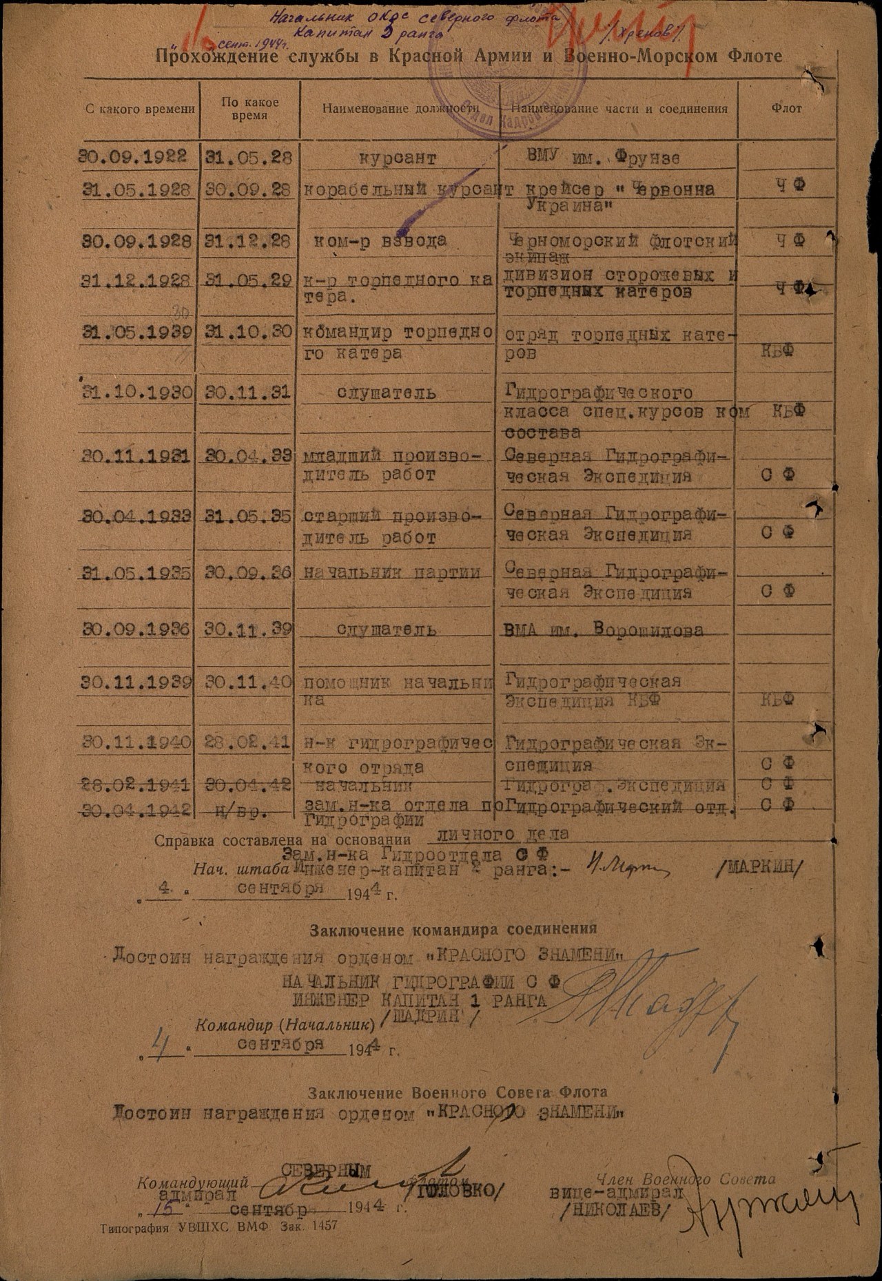 Место службы: геодезическая партия 1 гидрографическая экспедиция СФ
