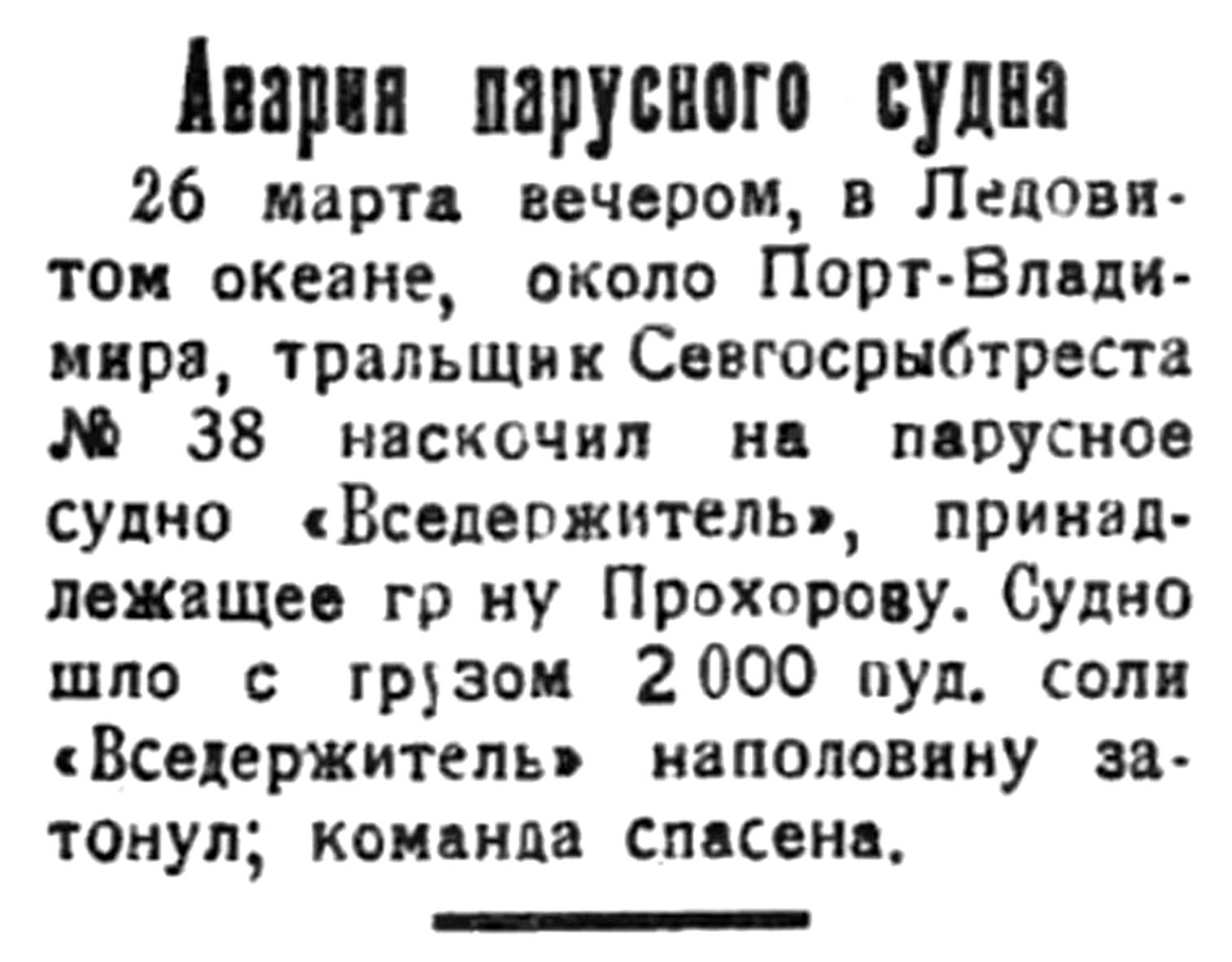 26 марта вечером, в Ледовитом океане, около Порт-Владимира, тральщик Севгосрыбтреста № 38 наскочил на парусное судно «Вседержитель», принадлежащее гр-ну Прохорову. Судно шло с грузом 2 000 пуд. соли. «Вседержитель» наполовину затонул; команда спасена.