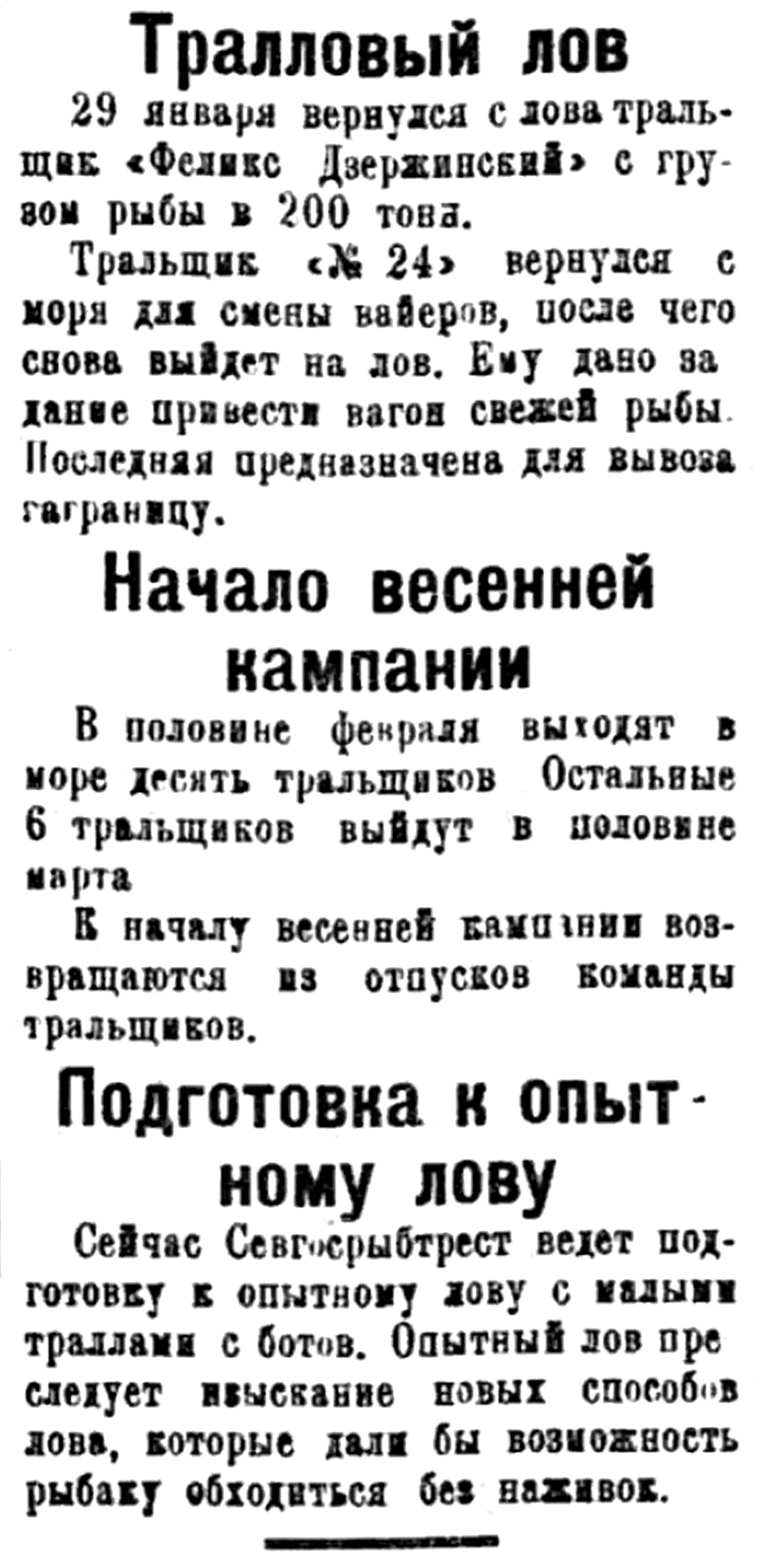 В настоящее время (с января по март) в Севгосрыбтресте проходит период зимнего траллового лова. В январе месяце 4-мя тральщиками было добыто 446188 клгр. рыбы тресковых пород и 17795 клгр. рыбьего жира.