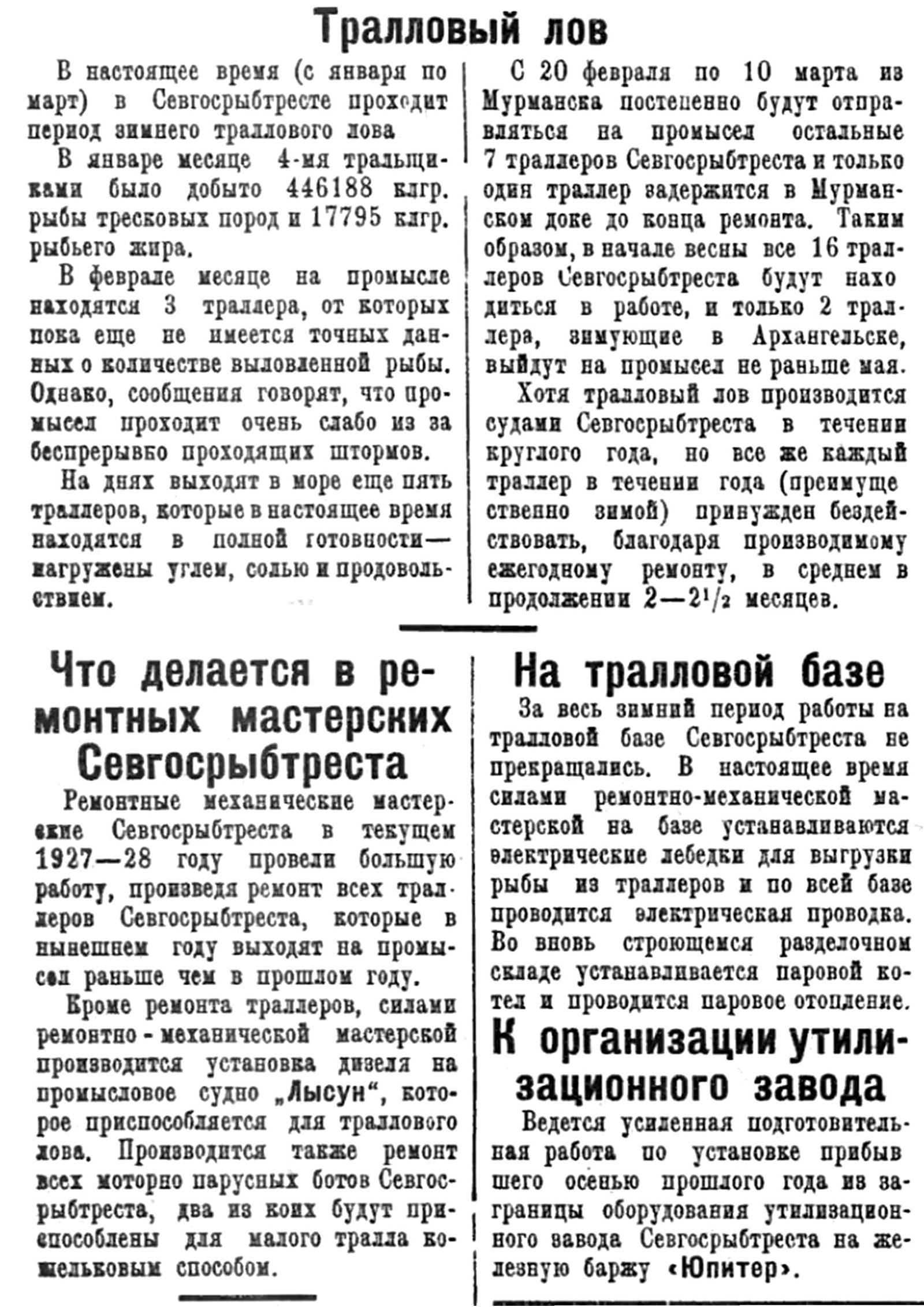 Ремонтные механические мастерские Севгосрыбтреста в текущем 1927—28 году провели большую работу, произведя ремонт всех траллеров Севгосрыбтреста, которые в нынешнем году выходят на промысел раньше чем в прошлом году.