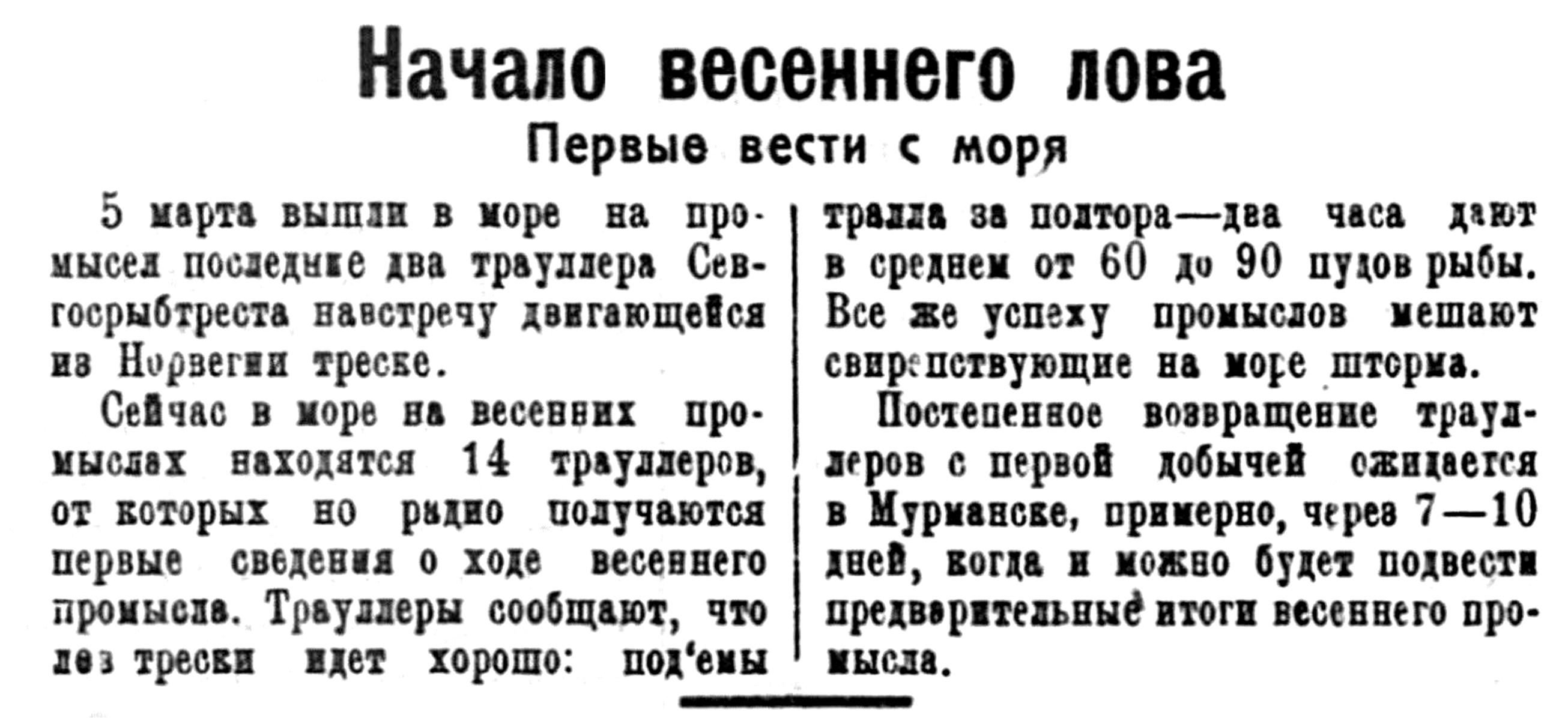 С 20 февраля по 10 марта из Мурманска постепенно будут отправляться на промысел остальные 7 траллеров Севгосрыбтреста и только один траллер задержится в Мурманском доке до конца ремонта. Таким образом, в начале весны все 16 траллеров Севгосрыбтреста будут находиться в работе, и только 2 траллера, зимующие в Архангельске, выйдут на промысел не раньше мая.