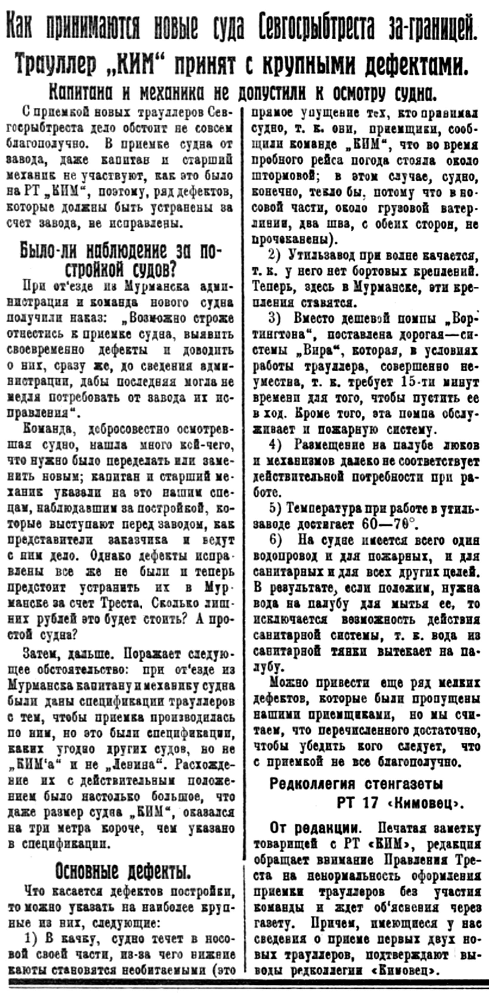 От редакции. Печатая заметку товарищей с РТ "КИМ", редакция обращает внимание правления Треста на ненормальность оформления приемка трауллеров без участия команды и ждет объяснения через газету. Причем, имеющиеся у нас сведения о приеме первых двух новых трауллеров, подтверждают выводы редколлегии "Кимовец".