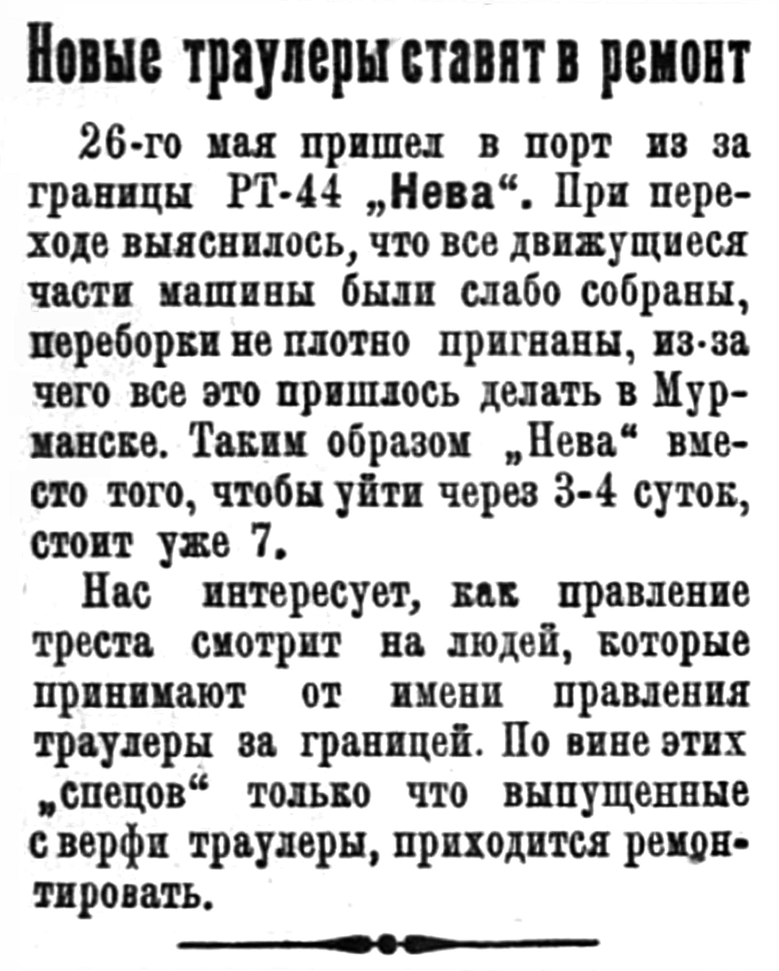 26-го мая пришел в порт из за границы РТ-44 „Нева". При переходе выяснилось, что все движущиеся части машины были слабо собраны, переборки не плотно пригнаны, из-за чего все это пришлось делать в Мурманске. Таким образом „Нева" вместо того, чтобы уйти через 3-4 суток, стоит уже 7.