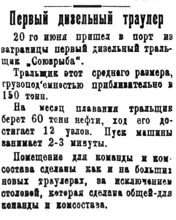 20-го июня пришел в порт из заграницы первый дизельный тральщик "Союзрыба".