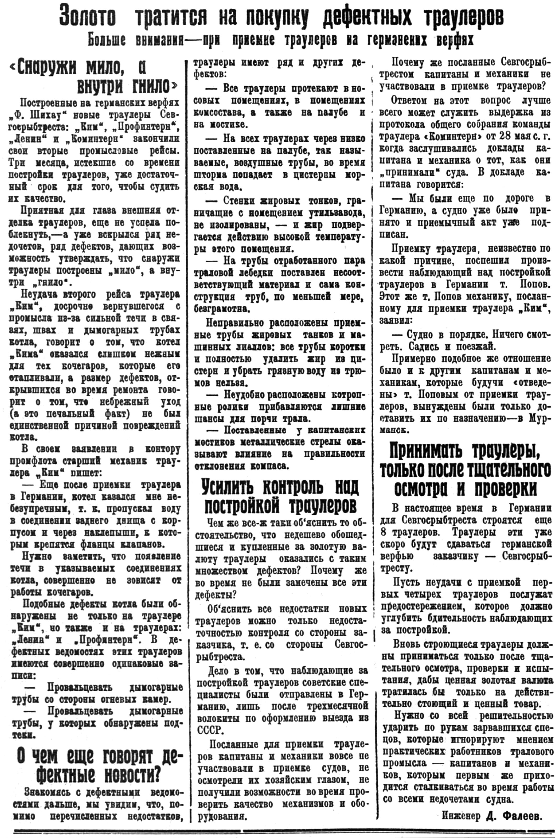 Вновь строющиеся траулеры должны приниматься только после тщательного осмотра, проверки и испытания, дабы ценная золотая валюта тратилась бы только на действительно стоющий и ценный товар.