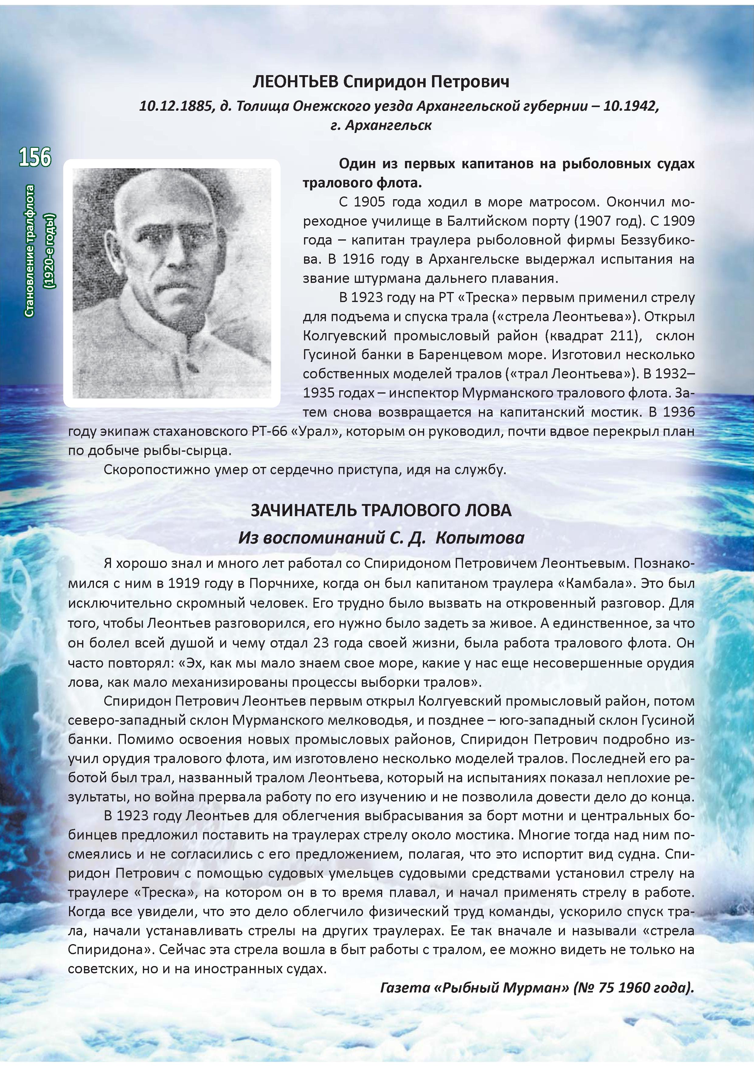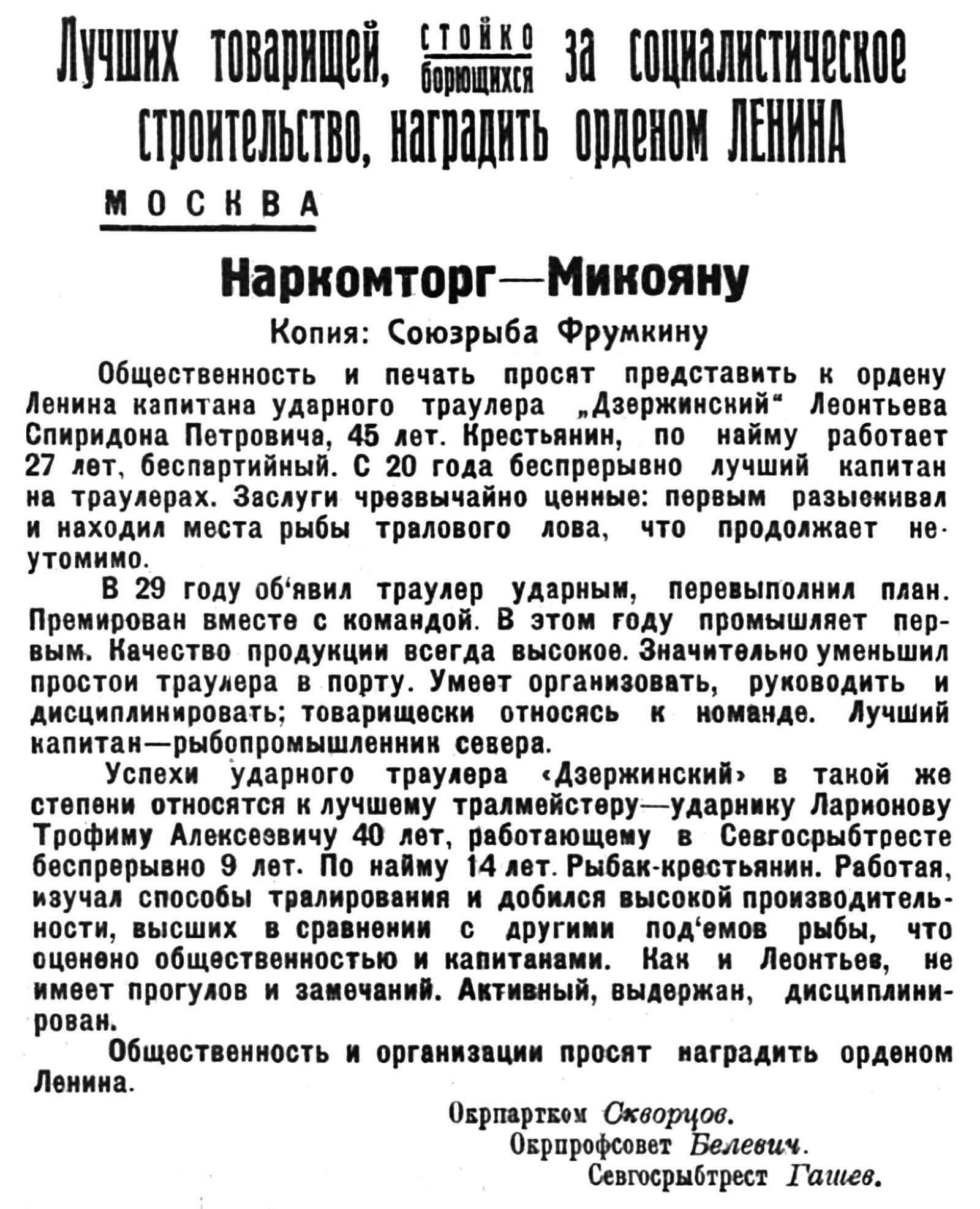 Общественность и печать просят представить к ордену Ленина капитана ударного траулера "Дзержинский" Леонтьева Спиридона Петровича, 45 лет. Крестьянин, по найму работает 27 лет, беспартийный. С 20 года беспрерывно лучший капитан на траулерах. Заслуги чрезвычайно ценные: первым разыскивал и находил места рыбы тралового лова, что продолжает неутомимо.
