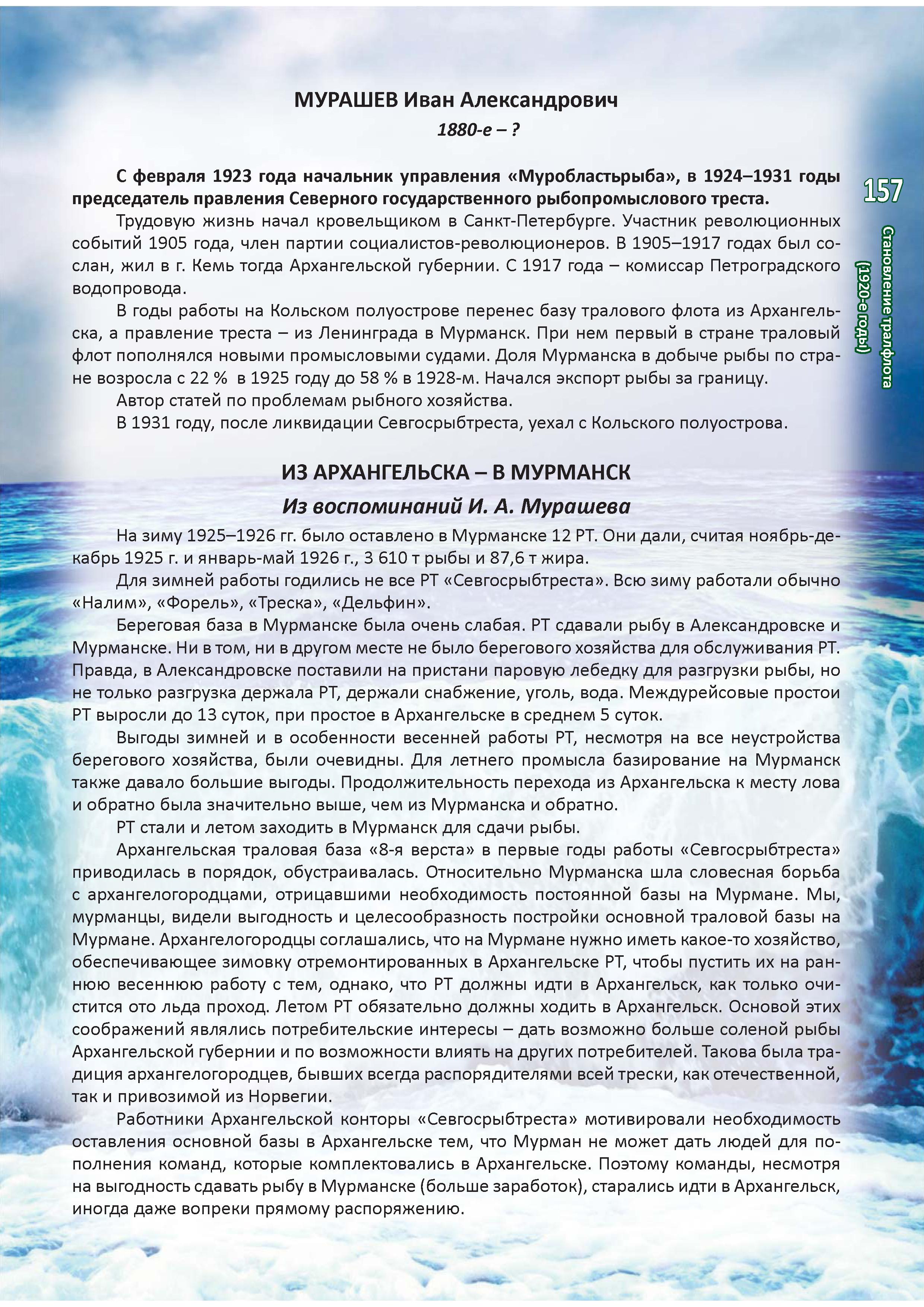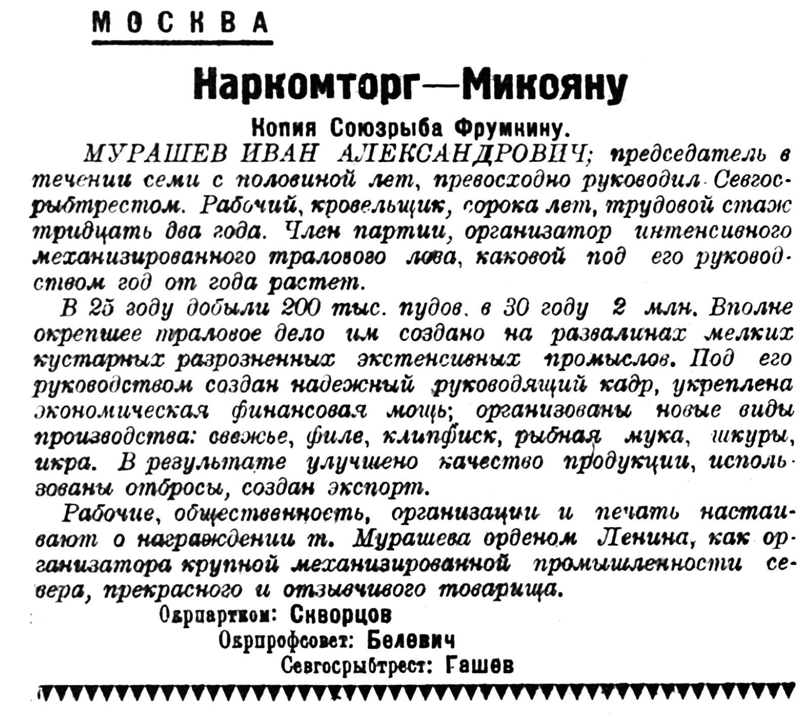 В 29 году объявил траулер ударным, перевыполнил план. Премирован вместе с командой. В этом году промышляет первым. Качество продукции всегда высокое. Значительно уменьшил простои траулера в порту. Умеет организовать, руководить и дисциплинировать; товарищески относясь к команде. Лучший напитан—рыбопромышленник севера.