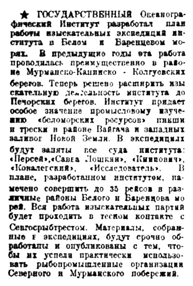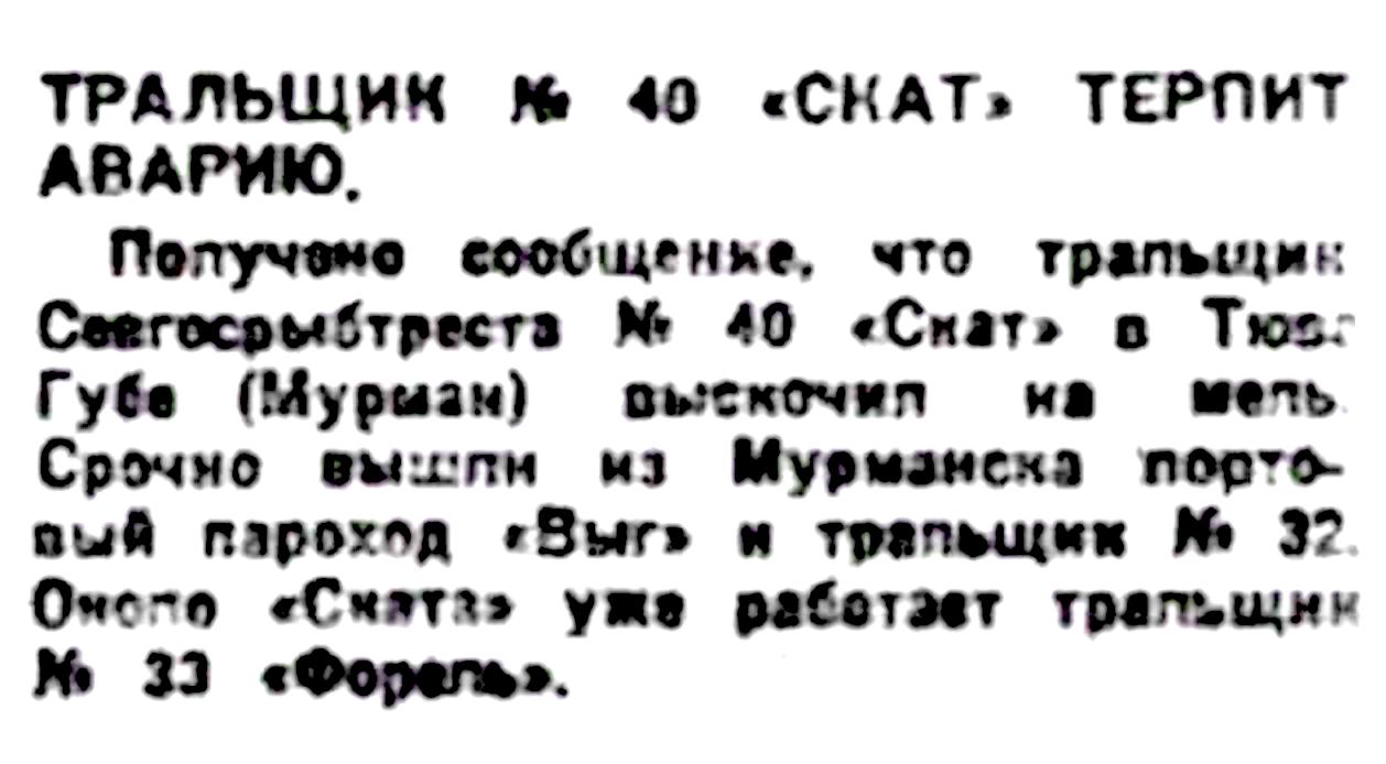 Тральщик «Пикша» пришел разгружать рыбу в Мурманск. Он вызван туда правлением Севгосрыбтреста для проверки ремонта, сделанного механическим заводом Севгосрыбтреста. Ремонт признан вполне удачным. Улов рыбы незначителен — всего 80 тонн.