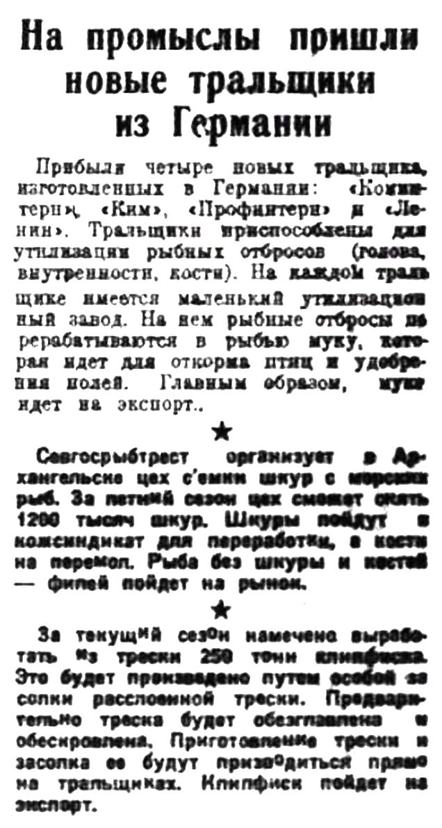 Построенные на германских верфях "Ф. Шихау" новые траулеры Севгосрыбтреста: "Ким", "Профинтерн", "Ленин" и "Коминтерн" закончили свои вторые промысловые рейсы. Три месяца, истекшие со времени постройки траулеров, уже достаточный срок для того, чтобы судить их качество.