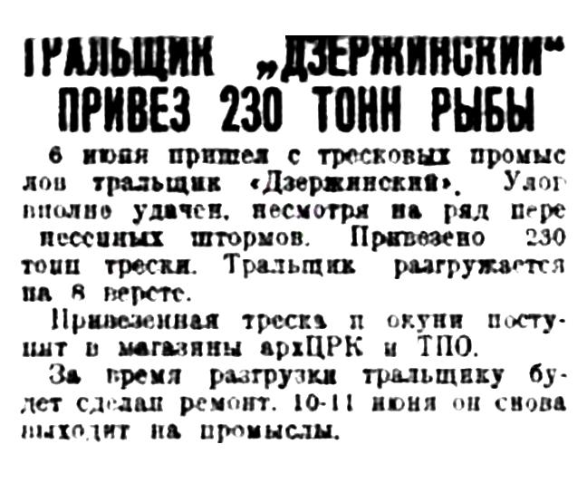 6 июня пришел с тресковых промыслов тральщик «Дзержинский». Улов вполне удачен, несмотря на ряд перенесенных штормов. Привезено 230 тонн и трески. Тральщик разгружается на 8 версте.