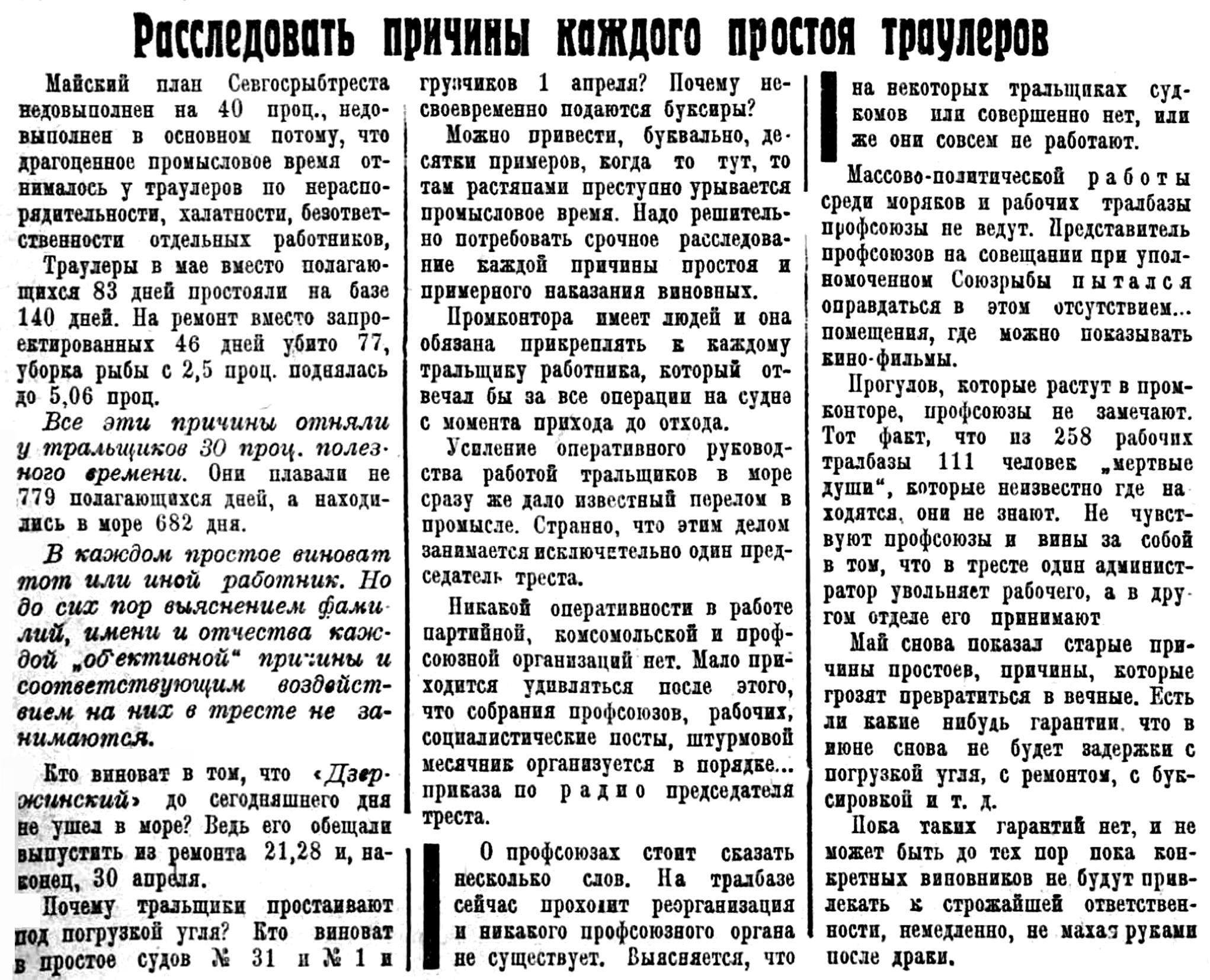 Майский план Севгосрыбтреста недовыполнен на 40 проц., недовыполнен в основном потому, что драгоценное промысловое время отнималось у траулеров по нераспорядительности, халатности, безответственности отдельных работников.