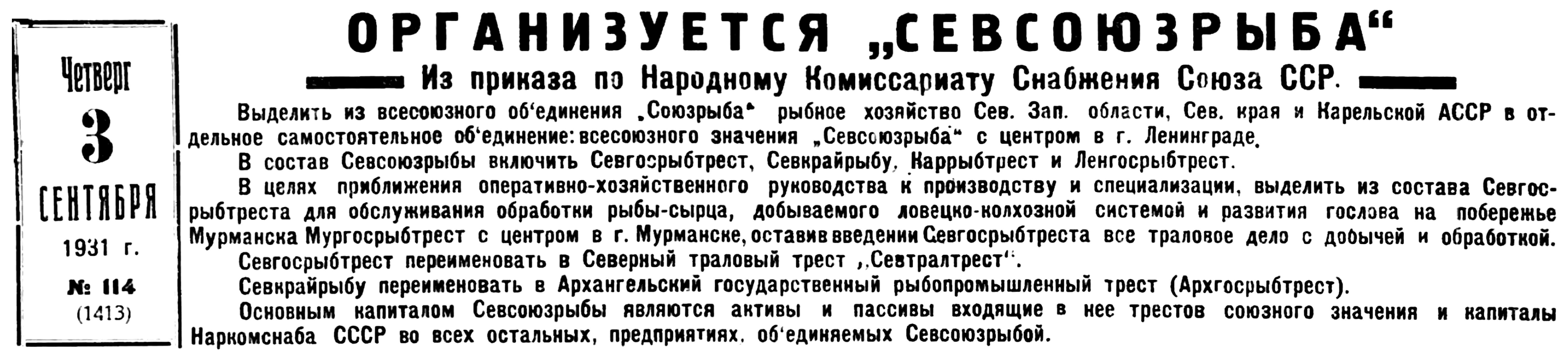 В связи с организацией Севсоюзрыбы и необходимостью разрешения вопросов, связанных с осенней путиной и развития рыбного района Севера — 25-го сентября с. г. в г. Ленинграде созывается совещание работников рыбной промышленности и ловецкой кооперации, со следующей повесткой дня: