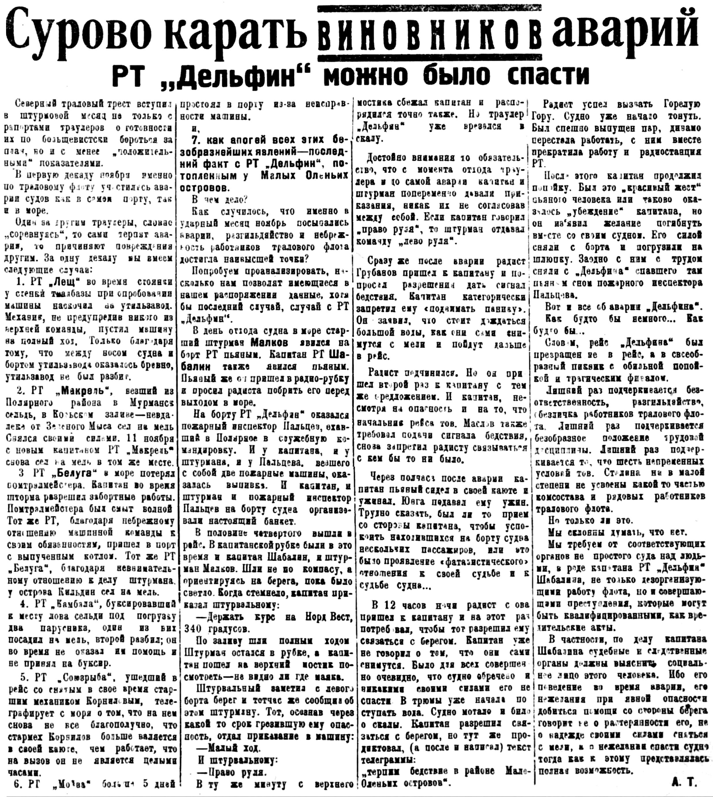Недавно в нашей газете сообщалось об аварии РТ "Дельфин". Судно затонуло у Малых Оленьих островов и сейчас ПТУ с ЭПРОНОМ (Экспедицией подводных работ особого назначения) ведутся переговоры о том, чтобы достать с затонувшего траулера хотя бы машину, динамо, лебедку и ряд других предметов оборудования.