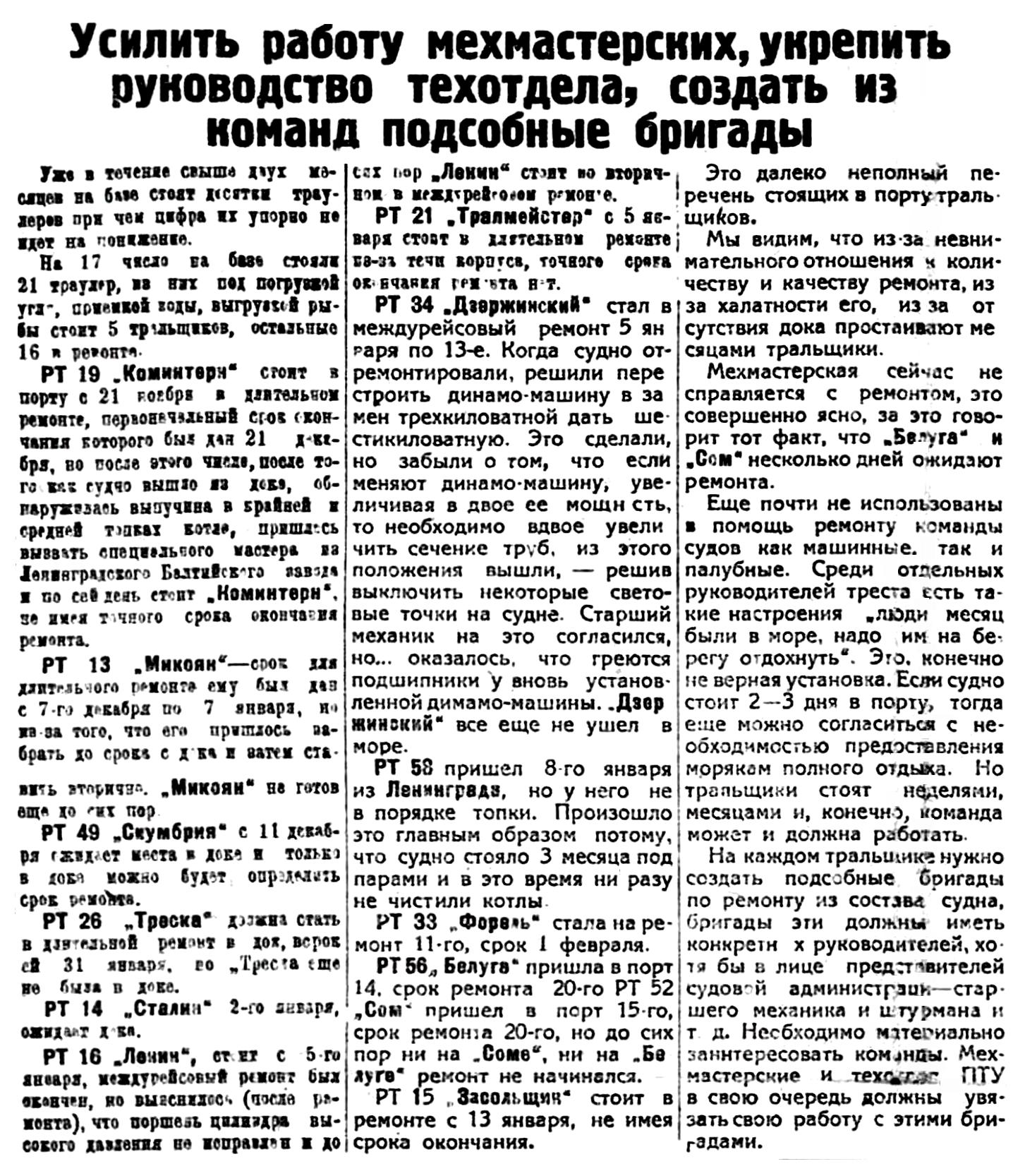 РТ 34 "Дзержинский" стал в междурейсовый ремонт 5 января по 13-е. Когда судно отремонтировали, решили перестроить динамо-машину в замен трехкиловатной дать шестикиловатную. Эго сделали, но забыли о том, что если меняют динамо-машину, увеличивая в двое ее мощность, то необходимо вдвое увеличить сечение труб, из этого положения вышли, — решив выключить некоторые световые точки на судне. Старший механик на это согласился, но... оказалось, что греются подшипники у вновь установленной димамо-машины. "Дзержинский" все еще не ушел в море.