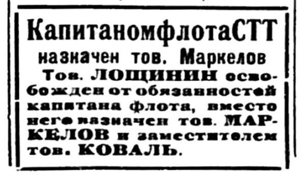 Тов. ЛОЩИНИН освобожден от обязанностей капитана флота, вместо него назначен тов. МАРКЕЛОВ и заместителем тов. КОВАЛЬ.