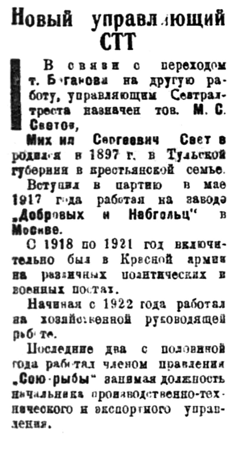 В связи с переходом т. Боганова на другую работу, управляющим Севтралтреста назначен тов. М. С. Светов.