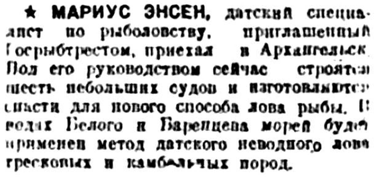 * МАРИУС ЭНСЕН, датский специалист по рыболовству, приглашенный Госрыбтрестом, приехал в Архангельск. Под его руководством сейчас строятся шесть небольших судов и изготовляются снасти для нового способа лова рыбы. В водах Белого и Баренцева морей будет применен метод датского неводного лова тресковых и камбальных пород.