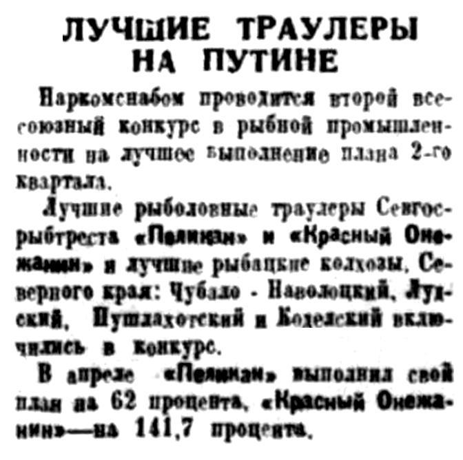 Все они перевыполнили план второго квартала. Красное переходящее знамя Севгосрыбтреста присуждено тральщику "Пеликан" (итальянской постройки). Он выполнил задание на 10 мая на 100,2 процента. Капитан тральщика тов. Иосиф Егорович Кононов. Но это первенство оспаривает тральщик № 308, советской конструкции и постройки. Капитан К. Г. Хохлин. К моменту прихода в Архангельск тральщик №308 выполнил задание второго квартала по лову трески на 127 процентов.