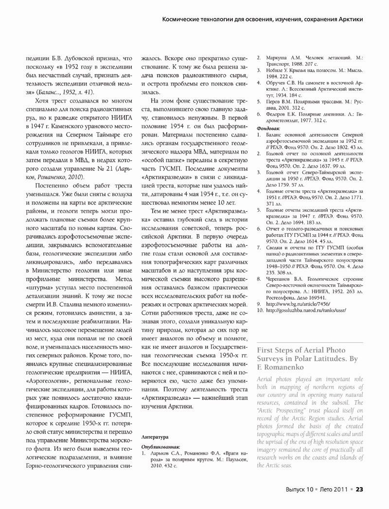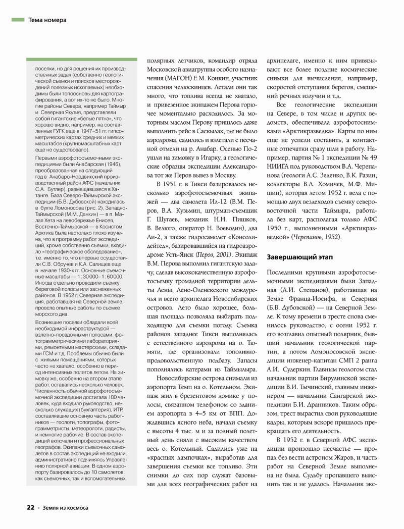 (Ст.н.с., кафедра геоморфологии и палеогеографии, географический факультет МГУ имени М. В. Ломоносова, 119991, г. Москва, Ленинские горы, д. 1, e-mail: faromanenko@mail. ru)Фотографирование Земли из космоса в настоящее время — один из главных методов ее исследования. Географы имеют возможность получать огромное количество разнообразных по разрешению, масштабу, цвету изображений в различных спектральных диапазонах для решения целого комплекса задач. Многие специалисты, особенно молодые и среднего поколения, уже не представляют свою работу без космических снимков, ежедневно обрабатывая их, но очень редко держат в руках небольшие черно-белые квадратные аэрофотоснимки (АФС), часто сохраняющие еще легкий характерный запах фотохимикалий. Их почти не осталось не только в научных и производственных, но и в специализированных картографических организациях, а новые съемки практически все — ведомственные. А между тем именно АФС сыграли главную роль не только в картографировании северных районов нашей страны, но и в открытии многих природных богатств, содержащихся в их недрах. Вспомним некоторые полузабытые или совершенно неизвестные эпизоды развития аэрофотосъемки высоких широт, сыгравшей столь большую роль в развитии нашего Севера. Гигантский труд тысяч людей сейчас практически забыт, как и имена создателей топографических, геологических или навигационных карт — продукта высококвалифицированного синтеза знаний.