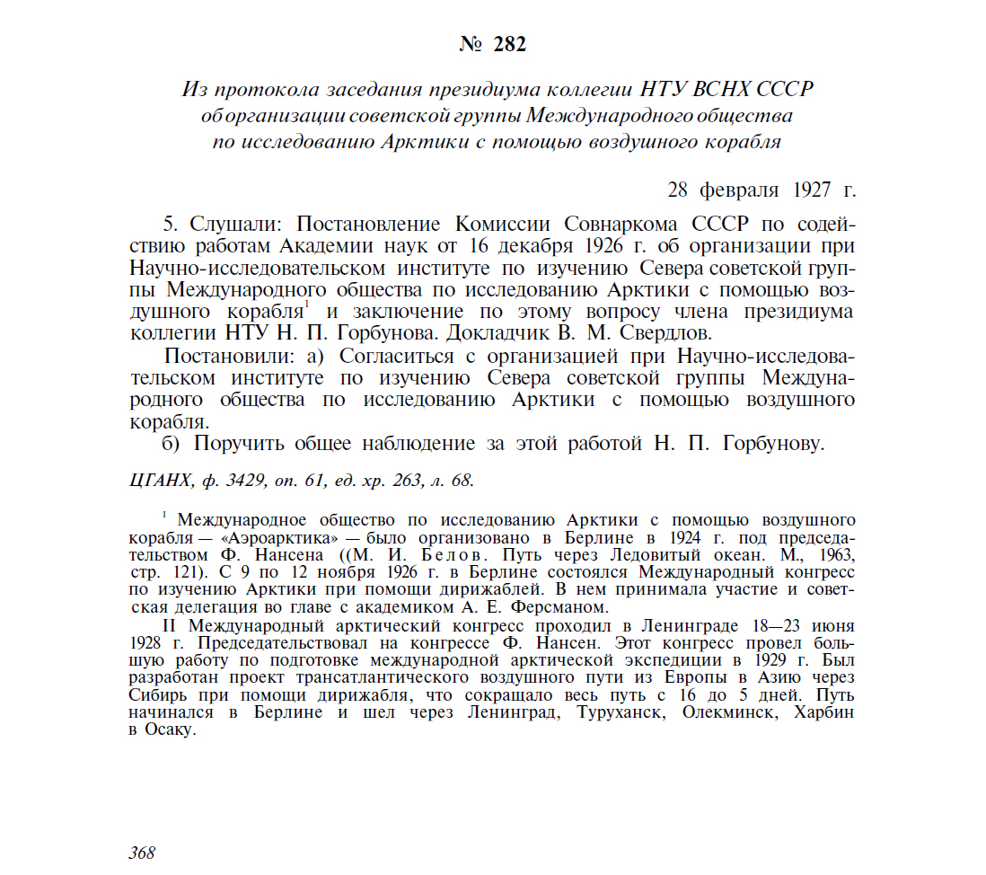Постановлением СНК Союза ССР на заседании 24 февраля (пр.№ 89) под моим председательством создана Комиссия для предварительной разработки вопроса о трансарктическом воздухоплавании.