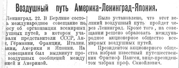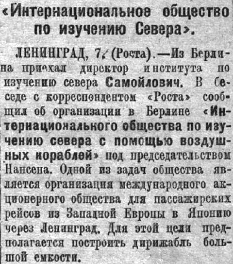 ЛЕНИНГРАД, 7. (Роста). — Из Берлина приехал директор института по изучению севера Самойлович. В беседе с корреспондентом «Роста» сообщил об организации в Берлине «Интернационального общества по изучению севера с помощью воздушных кораблей» под председательством Нансена. Одной из задач общества является организация международного акционерного общества для пассажирских рейсов из Западной Европы в Японию через Ленинград. Для этой цела предполагается построить дирижабль большой емкости.