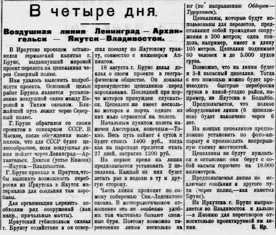 Нам удалось выяснить подробности проекта. Основной целью работ Брунса является установление воздушной связи между Европой и Тихим океаном. Ближайшие путь лежит через Северный полюс.