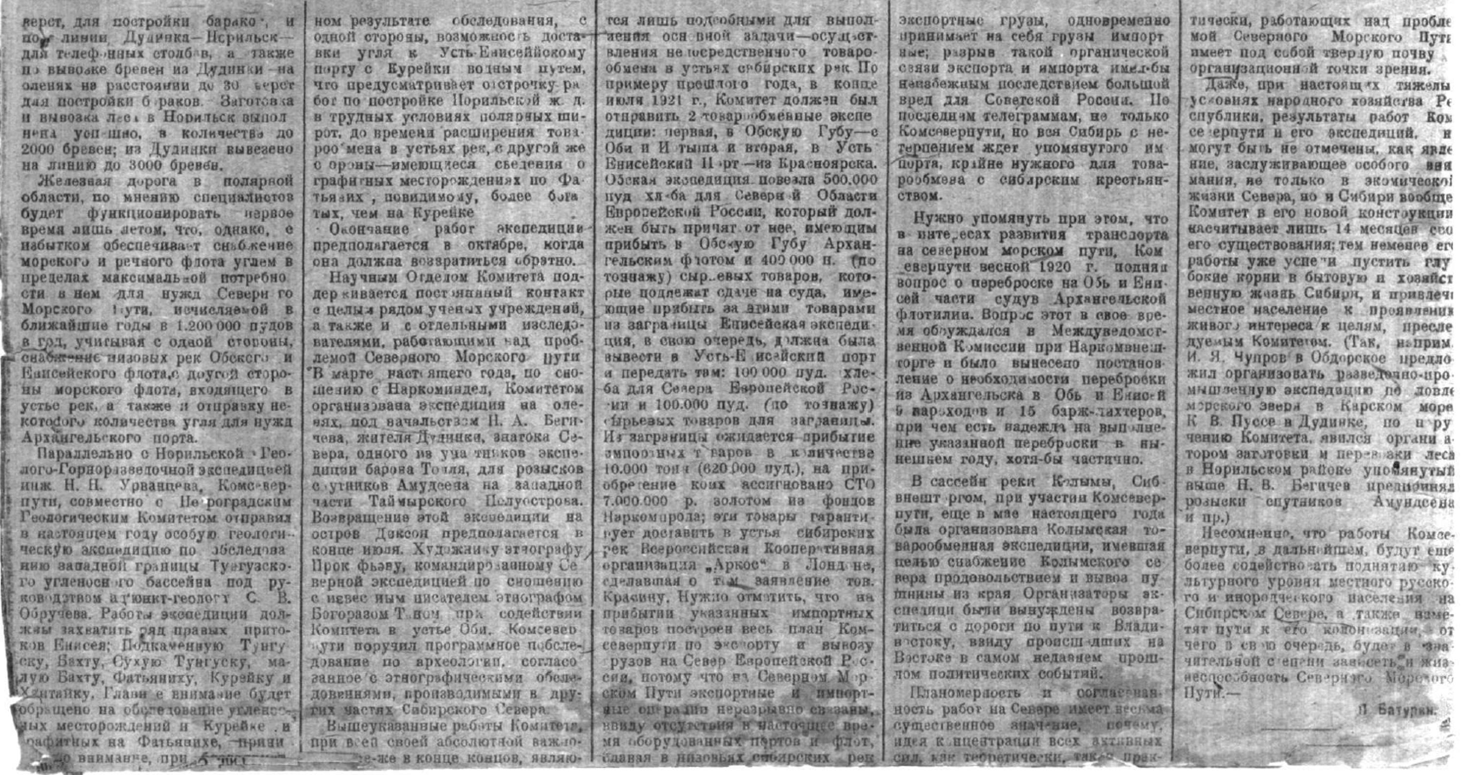 Даже, при настоящих тяжелых условиях народного хозяйства Республики, результаты работ Комсеверпути и его экспедиций, не могут быть не отмечены, как явление, заслуживающее особого внимания, не только в экономической жизни Севера, но и Сибири вообще. Комитет в его новой конструкции насчитывает лишь 14 месяцев своего существования; тем не менее его работы уже успели пустить глубокие корни в бытовую и хозяйственную жизнь Сибири, и привлечь местное население к проявлению живого интереса к целям, преследуемым Комитетом. (Так, наприм. И. Я. Чупров в Обдорское предложил организовать разведочно-промышленную экспедицию по ловле морского зверя в Карском море. К. В. Пуссе в Дудинке, по поручению Комитета, явился организатором заготовки и перевозки леса в Норильском районе, упомянутый выше Н. В. Бегичев предпринял розыски спутников Амундсена и пр.)