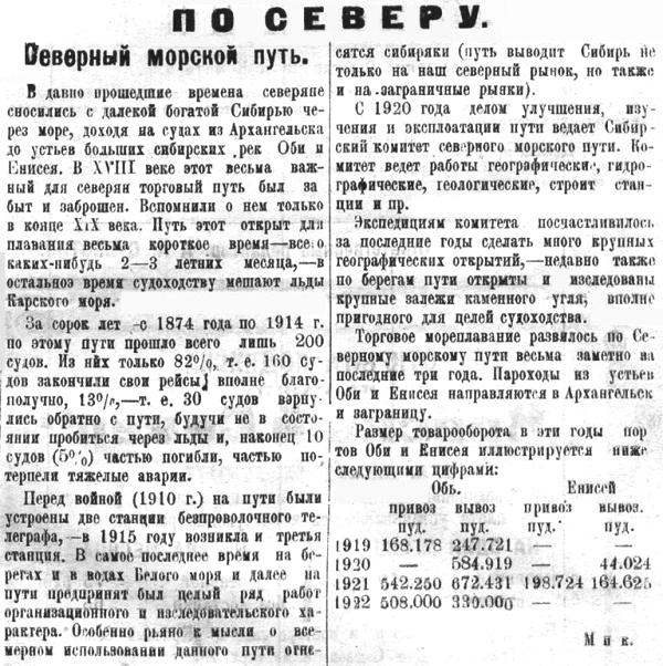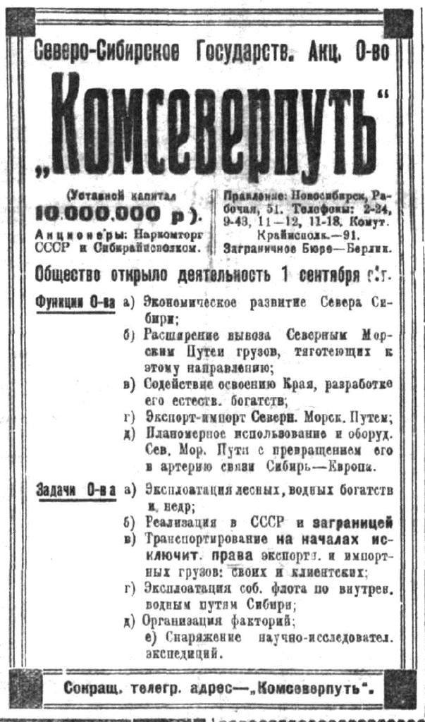 Реорганизованный в 1920 г. Комитет Северного Морского Пути при Сибревкоме - объединяет в себе все отдельные работы и научные исследования на Севере, имеющие непосредственное отношение к делу установления правильного товарообмена Сибири с Западной Европой и Америкой через Северный Ледовитый Океан, и практически осуществляет указанный товарообмен.