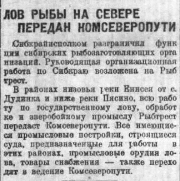 1 марта 1931 г. в Cеверо-Cибирском Государственном акционерном обществе Наркомата внешней и внутренней торговли СССР «Комсеверпуть» завершилась реорганизация.
