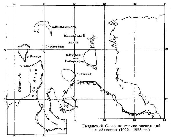 Важное географическое открытие сделала другая научная экспедиция комсеверпути, которая вышла из Новониколаевска в июне месяце этого года на моторной шхуне "Агнесса". Имея в числе других своих заданий — обследование Гыдаямского залива, расположенного между Обской губой и Енисейским заливом — шхуна "Агнесса" вышла из Обской губи в Ледовитый океан и, обогнув мыс Тараеоль, считавшийся до сего времени крайним северо восточным пунктом Гыдаямского полуострова, открыта, что мыс этот принадлежит не полуострову, а острову, впервые открытому. Остров этот назван "Агнесса" по имени шхуны. Двигаясь далеко на юг вдоль восточного берега острова, шхуна вошла в Гыдаямский залив. Минуя пролив, отделяющий остров от материка и делая промеры глубин, путешественники открыли вход из океана в залив с глубинами в 23 и 25 футов, на берегу острова поставили знак на месте найденного здесь мамонта.