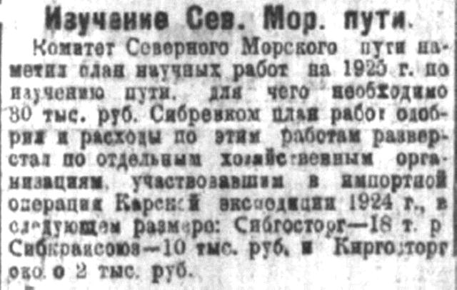 Комитет Северного Морского пути наметил план научных работ на 1925 г. по изучению пути, для чего необходимо 30 тыс. руб. Сибревком план работ одобрил и расходы по этим работам разверстал по отдельным хозяйственным организациям участвовавшим в импортной операции Карской экспедиции 1924 г., в следующем размере: Сибгосторг — 18 т. р. Сибкрайсоюз — 10 тыс. руб. в Киргосторг около — 2 тыс. руб.