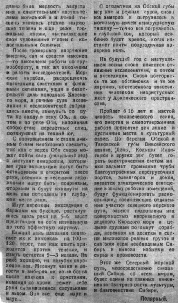 Пройдет 8-10 лет и настойчивость человеческого гения, его энергия и самоотверженная работа превратят эти дькие и пустынные места в культурный оазис. По берегам Обской и Тазовской губы Енисейского залива, Лены, Колымы, Индигирки и других рек будет гореть электрическим светом маяки задымят громадные трубы благоустроенных перегрузочных портов, элеваторов и доков, введется электрическое освещение в жилых рабочих помещений, будут функционировать радиостанции, соединяющие отдаленные участки северного морского пути, зареют гидропланы над поверхностью неприветного и ледяного Карского моря и целыми группами поплывут корабля, перевозя на десятки и сотни миллионов равных грузов и снабжая всем необходимым Сибирь и вывозя избытки ее сырья и производств.