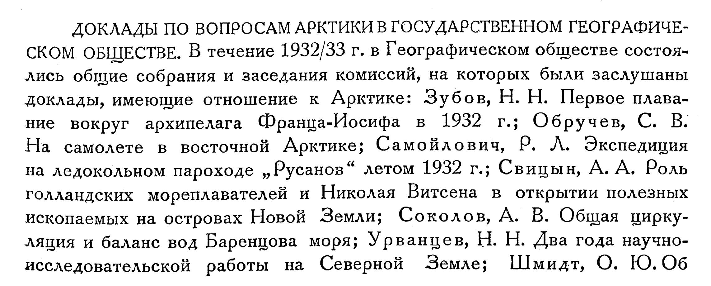 ДОКЛАДЫ ПО ВОПРОСАМ АРКТИКИ В ГОСУДАРСТВЕННОМ ГЕОГРАФИЧЕСКОМ ОБЩЕСТВЕ. В течение 1932/33 г. в Географическом обществе состоялись общие собрания и заседания комиссий, на которых были заслушаны доклады, имеющие отношение к Арктике: Зубов, H. Н. Первое плавание вокруг архипелага Франца-Иосифа в 1932 г.; Обручев, С. В. На самолете в восточной Арктике; Самойлович, Р. Л. Экспедиция на ледокольном пароходе „Русанов“ летом 1932 г.; Свицын, А. А. Роль голландских мореплавателей и Николая Витсена в открытии полезных ископаемых на островах Новой Земли; Соколов, А. В. Общая циркуляция и баланс вод Баренцова моря; Урванцев, H. Н. Два года научно-исследовательской работы на Северной Земле; Шмидт, О. Ю. Об экспедиции на ледоколе „Сибиряков" через Ледовитый океан (Архангельск — Тихий Океан). Председатель Организационного комитета Съезда Р. Л. Самойлович на общем собрании прочел доклад „Советская Арктика за 15 лет“.