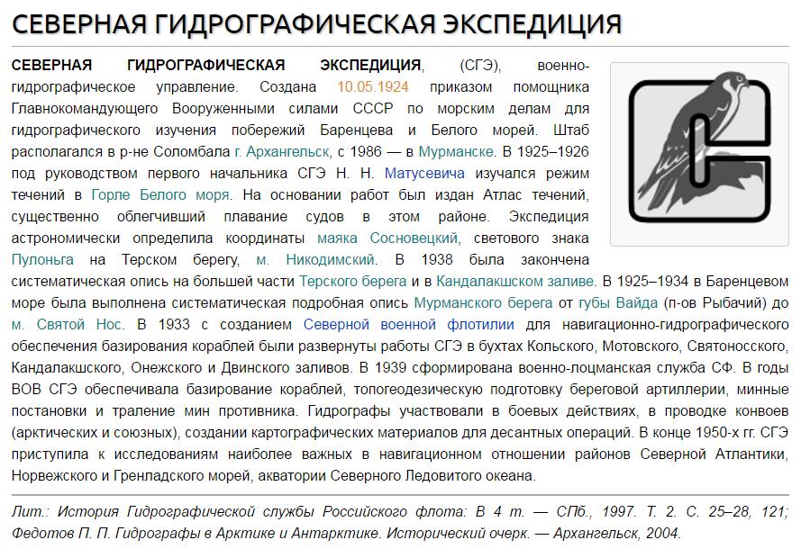СЕВЕРНАЯ ГИДРОГРАФИЧЕСКАЯ ЭКСПЕДИЦИЯ, (СГЭ), военно-гидрографическое управление. Создана 10.05 1924 приказом помощника Главнокомандующего Вооруженными силами СССР по морским делам для гидрографического изучения побережий Баренцева и Белого морей. Штаб располагался в р-не Соломбала г. Архангельск, с 1986 — в Мурманске. В 1925-1926 под руководством первого начальника СГЭ Н. Н. Матусевича изучался режим течений в Горле Белого моря. На основании работ был издан Атлас течений, существенно облепивший плавание судов в этом районе. Экспедиция астрономически определила координаты маяка Сосновецкий, светового знака Пулоньга на Терском берегу, м. Никодимский. В 1938 была закончена систематическая опись на большей части Терского берега и в Кандалакшском заливе. В 1925-1934 в Баренцевом море была выполнена систематическая подробная опись Мурманского берега от губы Вайда (п-ов Рыбачий) до м. Святой Нос. В 1933 с созданием Северной военной флотилии для навигационногидрографического обеспечения базирования кораблей были развернуты работы СГЭ в бухтах Кольского, Мотовского, Святоносского, Кандалакшского, Онежского и Двинского заливов. В 1939 сформирована военно-лоцманская служба СФ. В годы ВОВ СГЭ обеспечивала базирование кораблей, топогеодезическую подготовку береговой артиллерии, минные постановки и траление мин противника. Гидрографы участвовали в боевых действиях, в проводке конвоев (арктических и союзных), создании картографических материалов для десантных операций. В конце 1950-х гг. СГЭ приступила к исследованиям наиболее важных в навигационном отношении районов Северной Атлантики, Норвежского и Гренландского морей, акватории Северного Ледовитого океана.