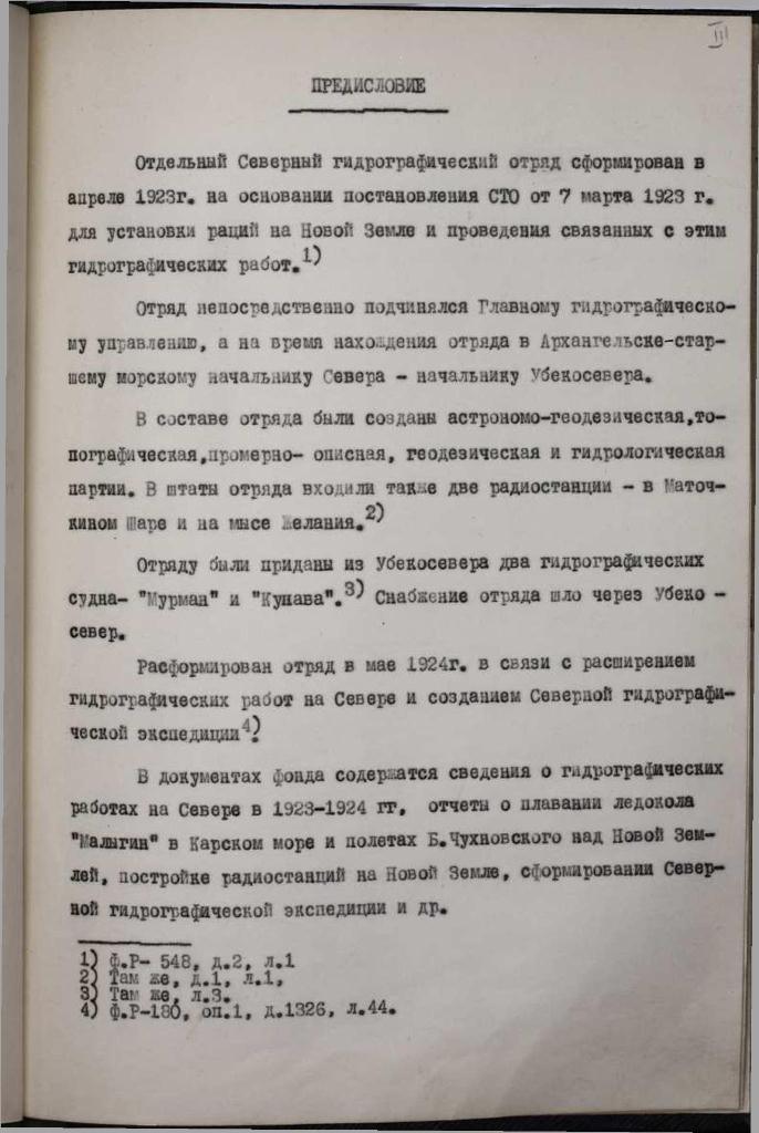 Отдельный Северный гидрографический отряд сформирован в апреле 1923 г. на основании постановления СТО от 7 марта 1923 г. для установки раций на Новой Земле и проведения связанных с этим гидрографических работ. 1)